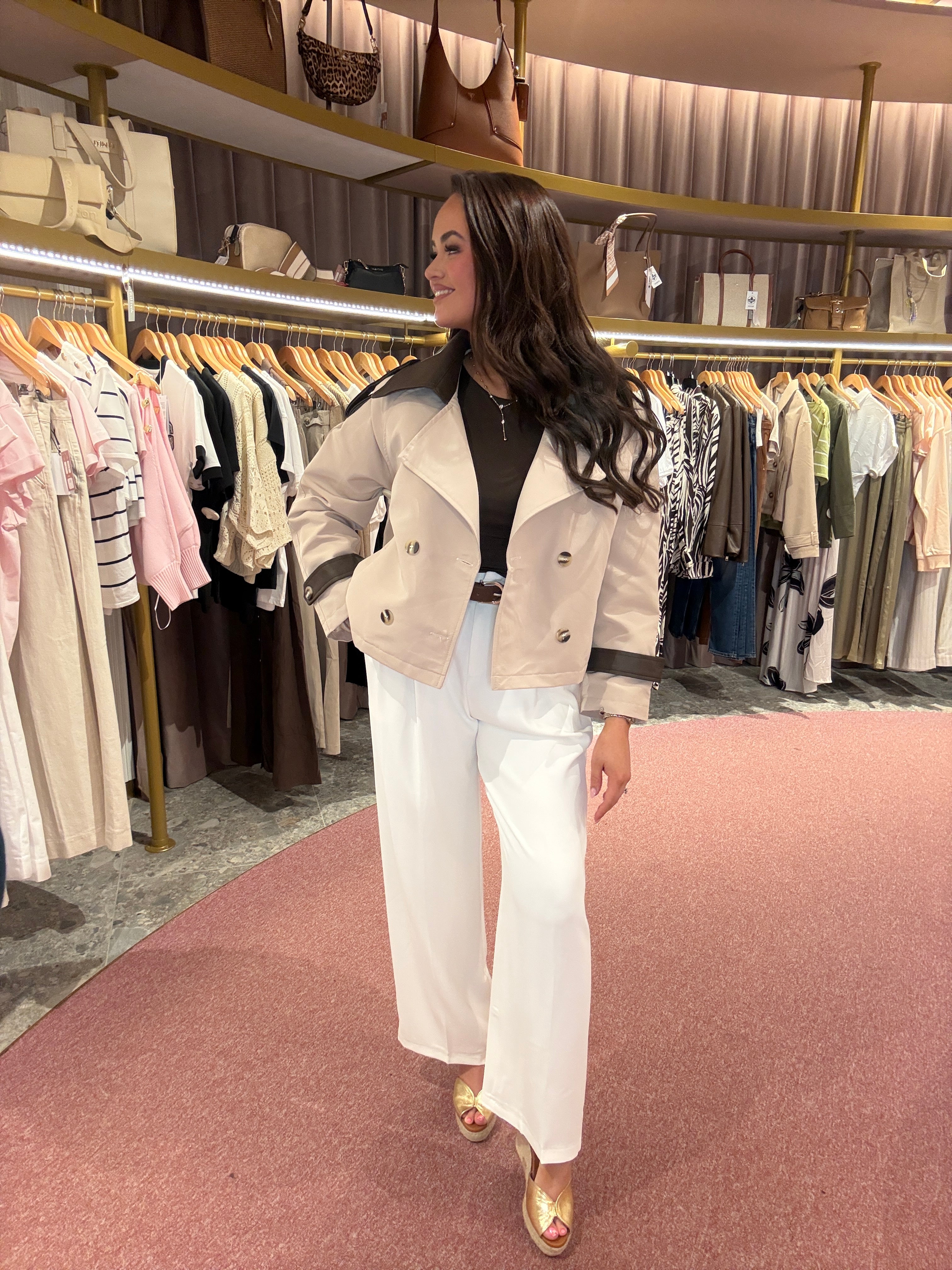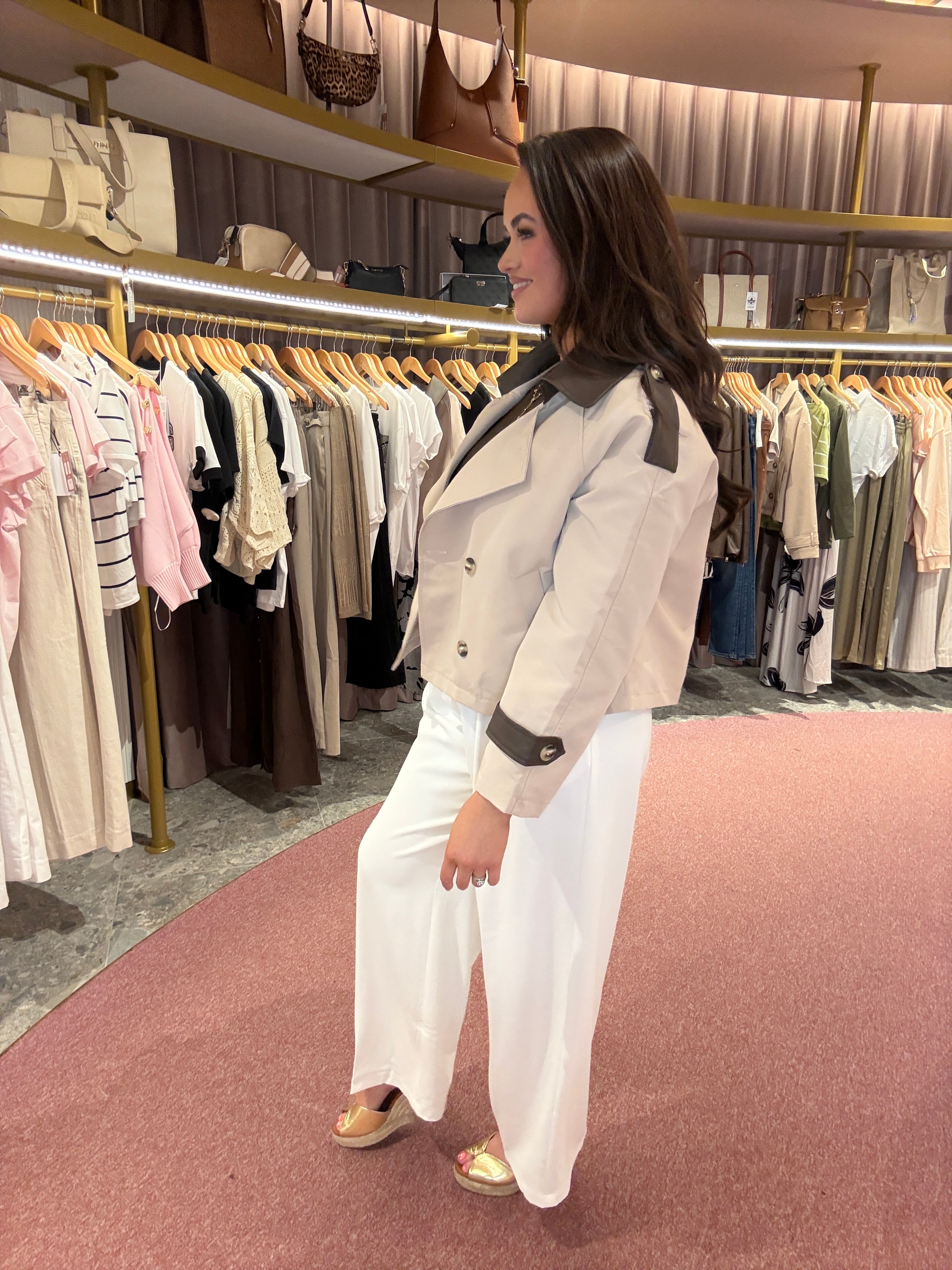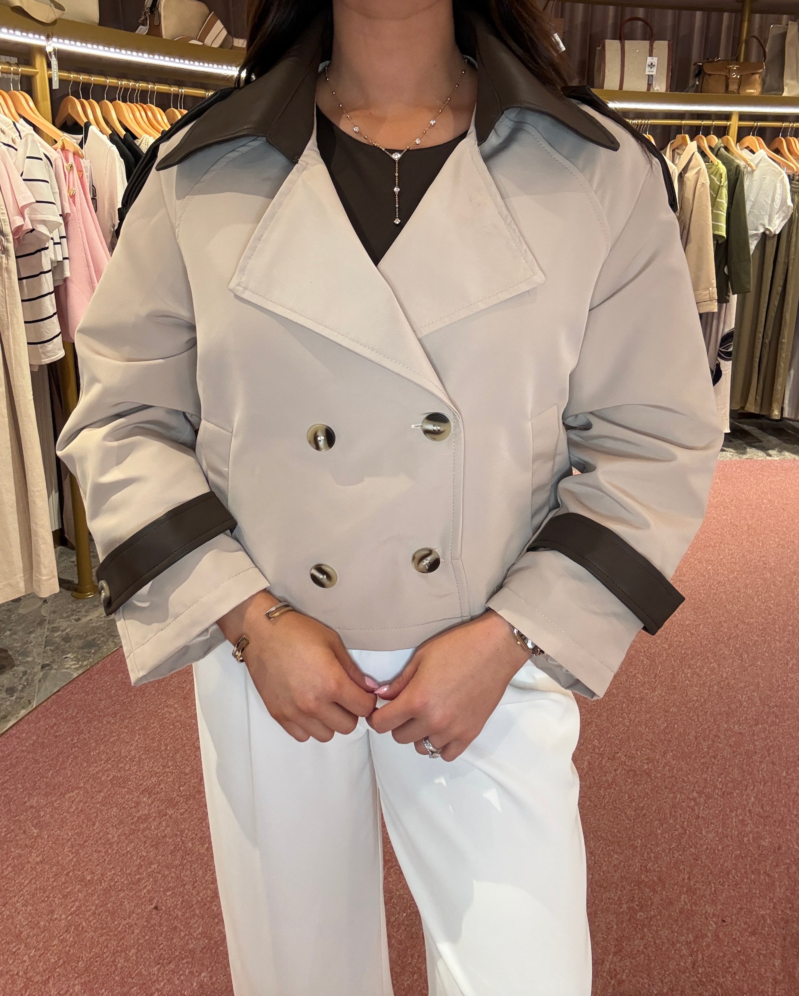 Cropped Trench Jacket With Brown PU B608 - Beige/Pu (FF7)