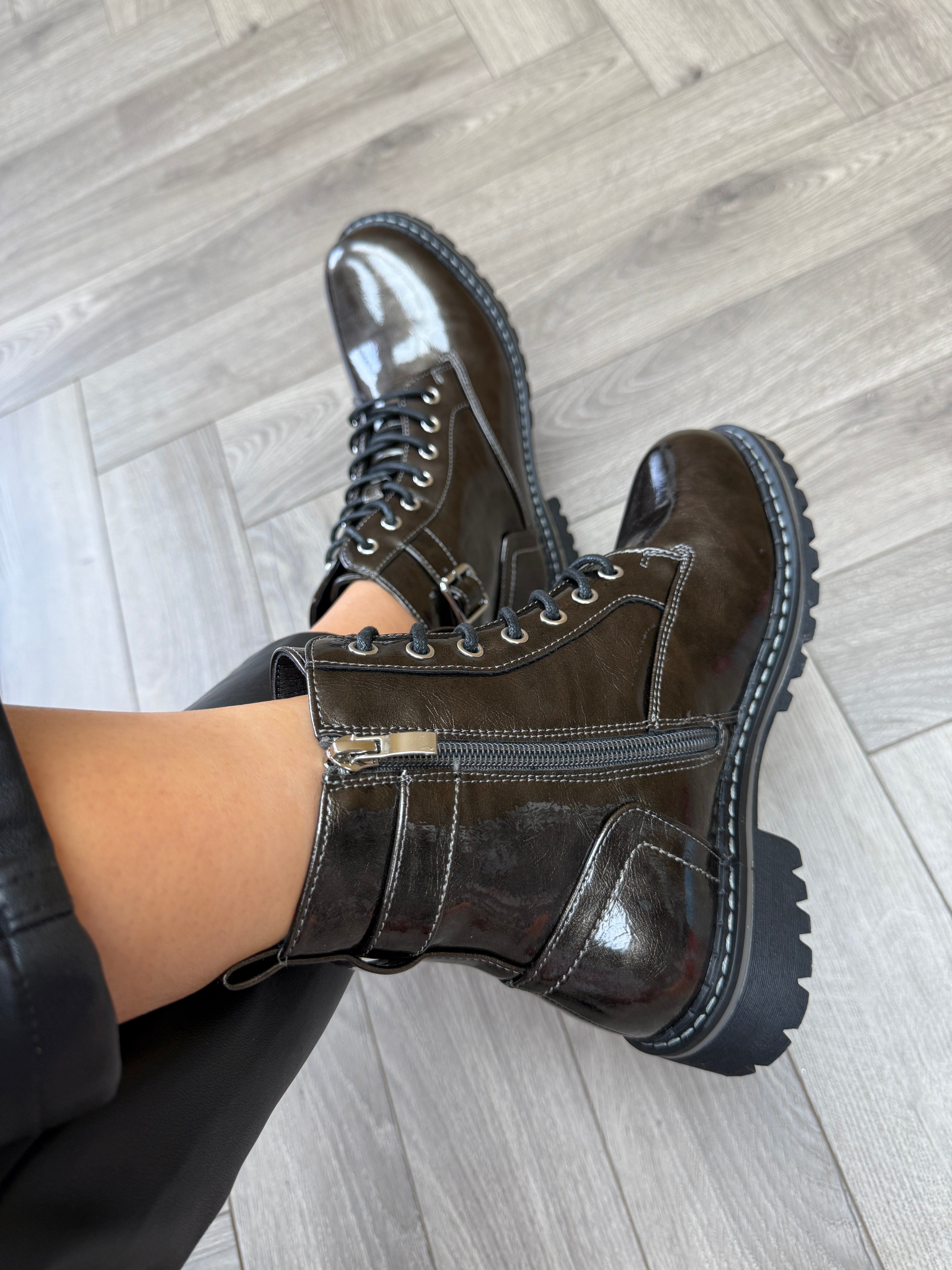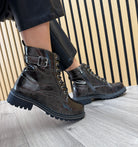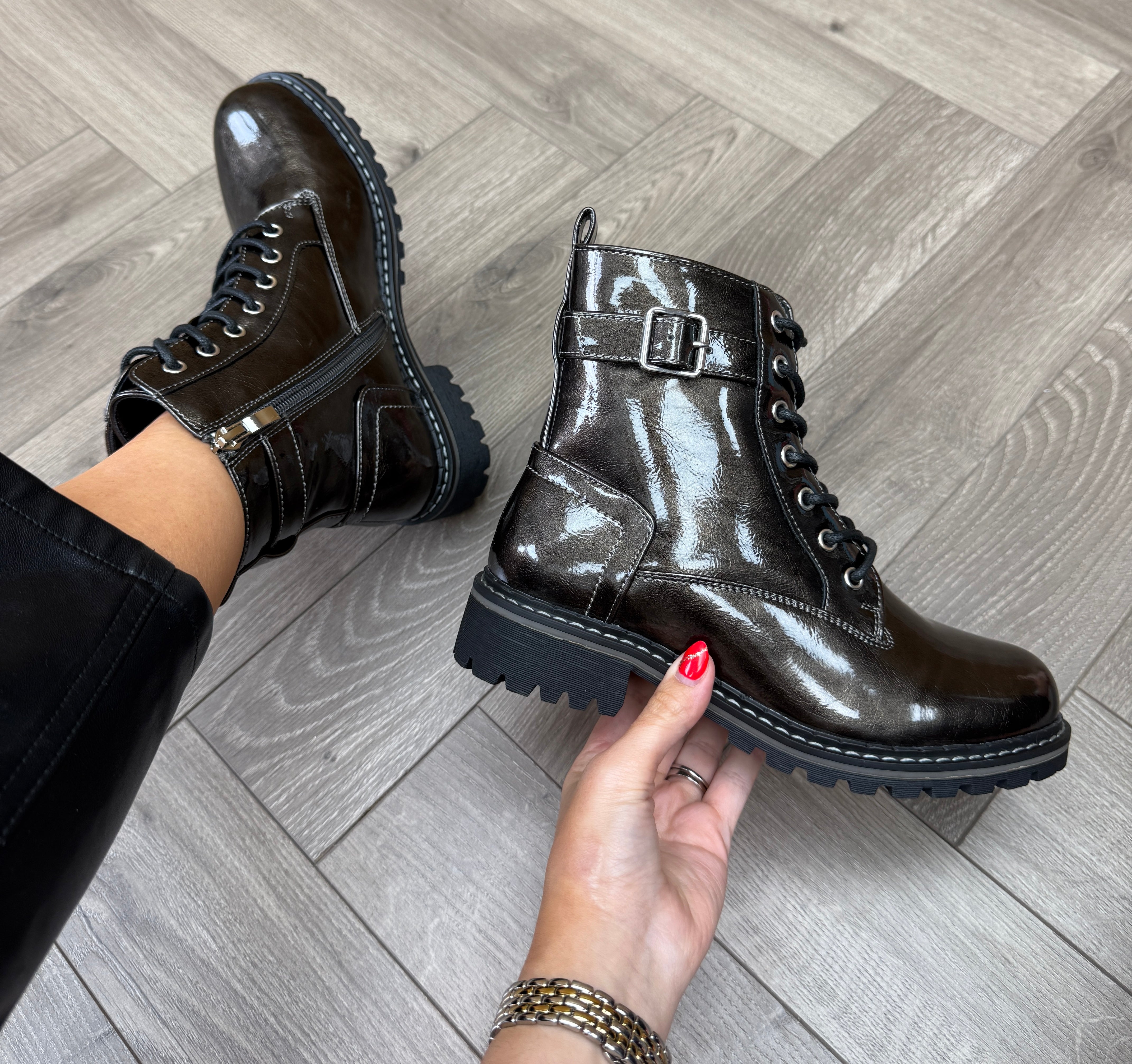 Lunar ‘Parlour’ GLW030 Patent Biker Boot With Buckle - Grey Patent (L48AW)