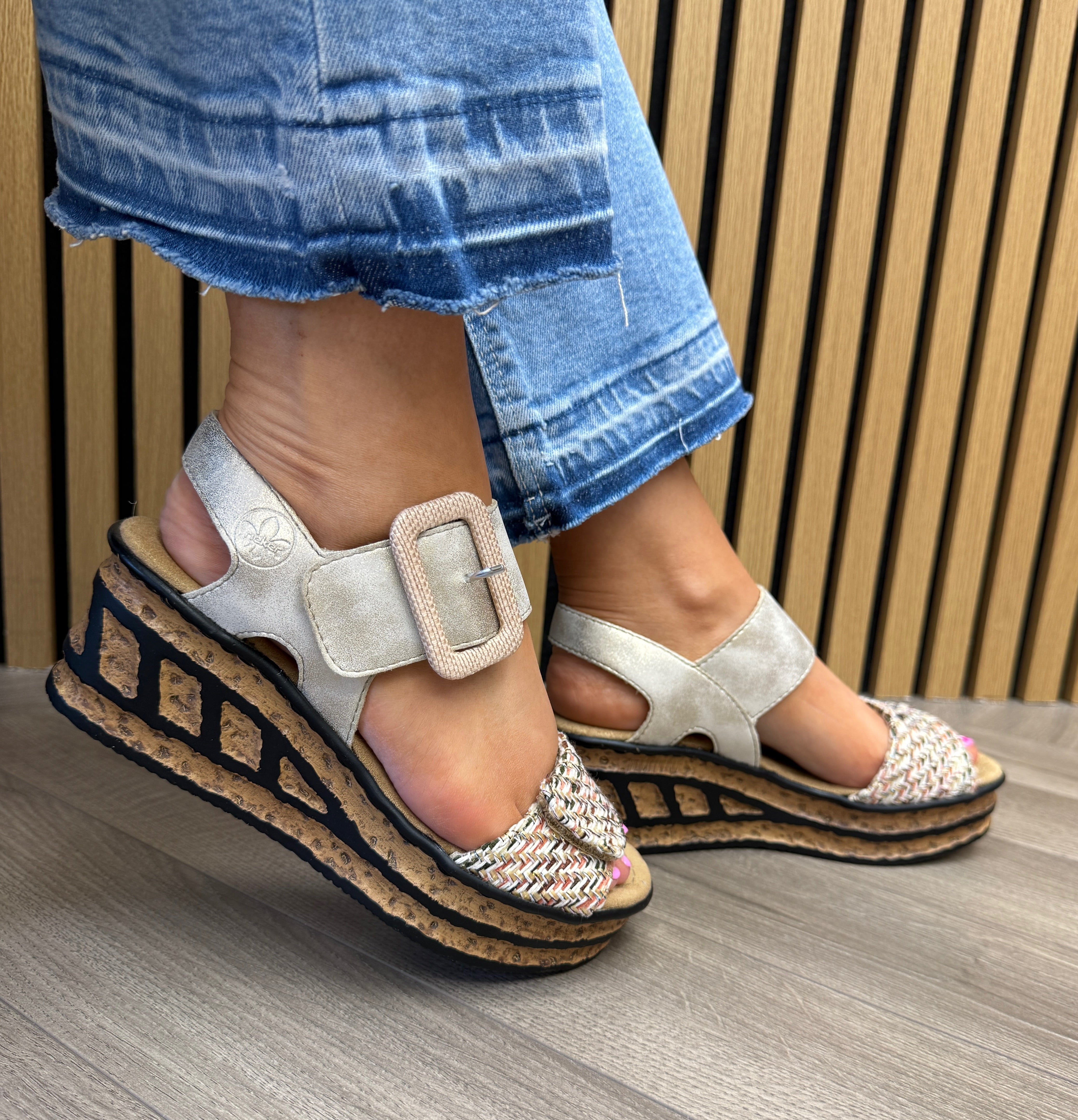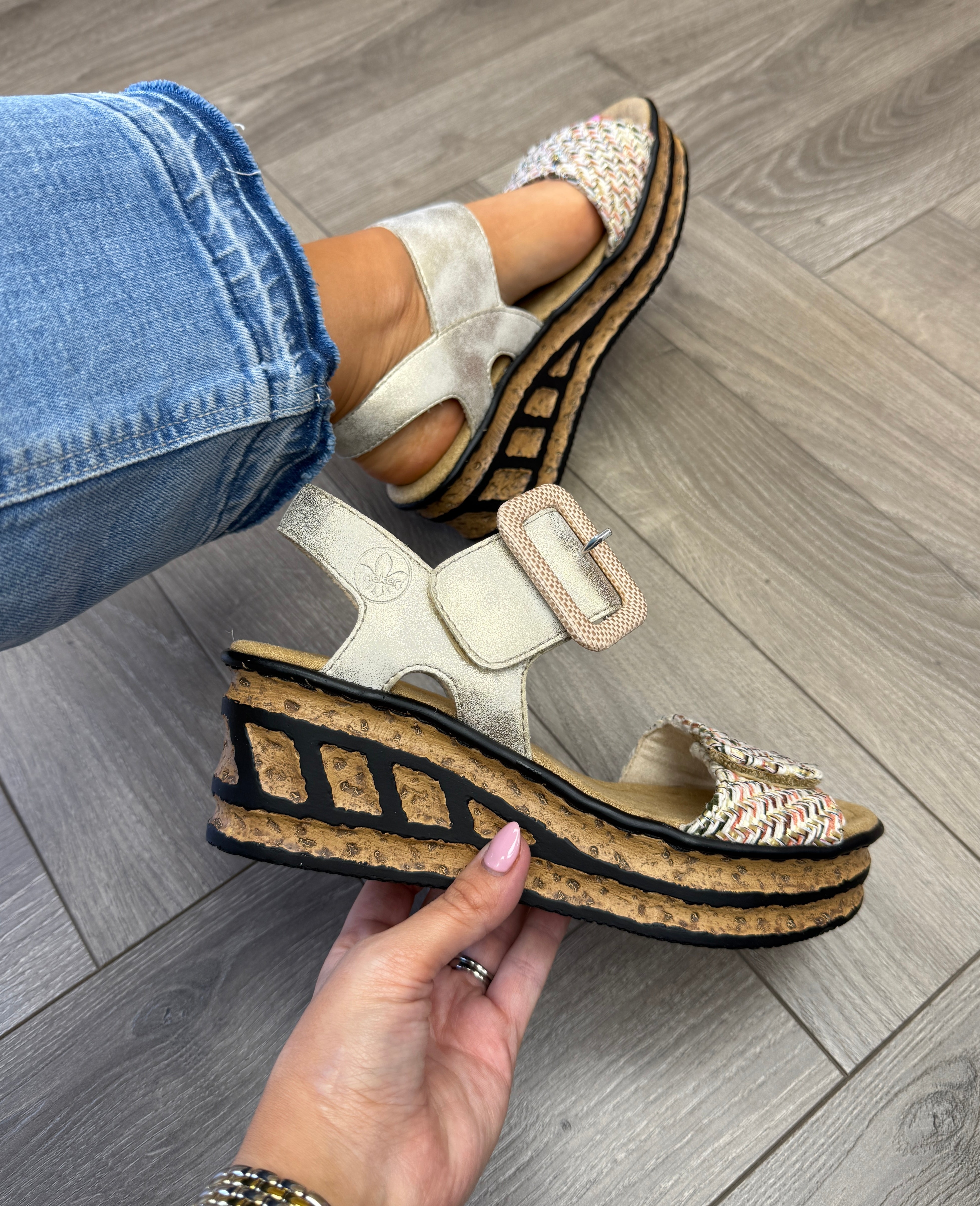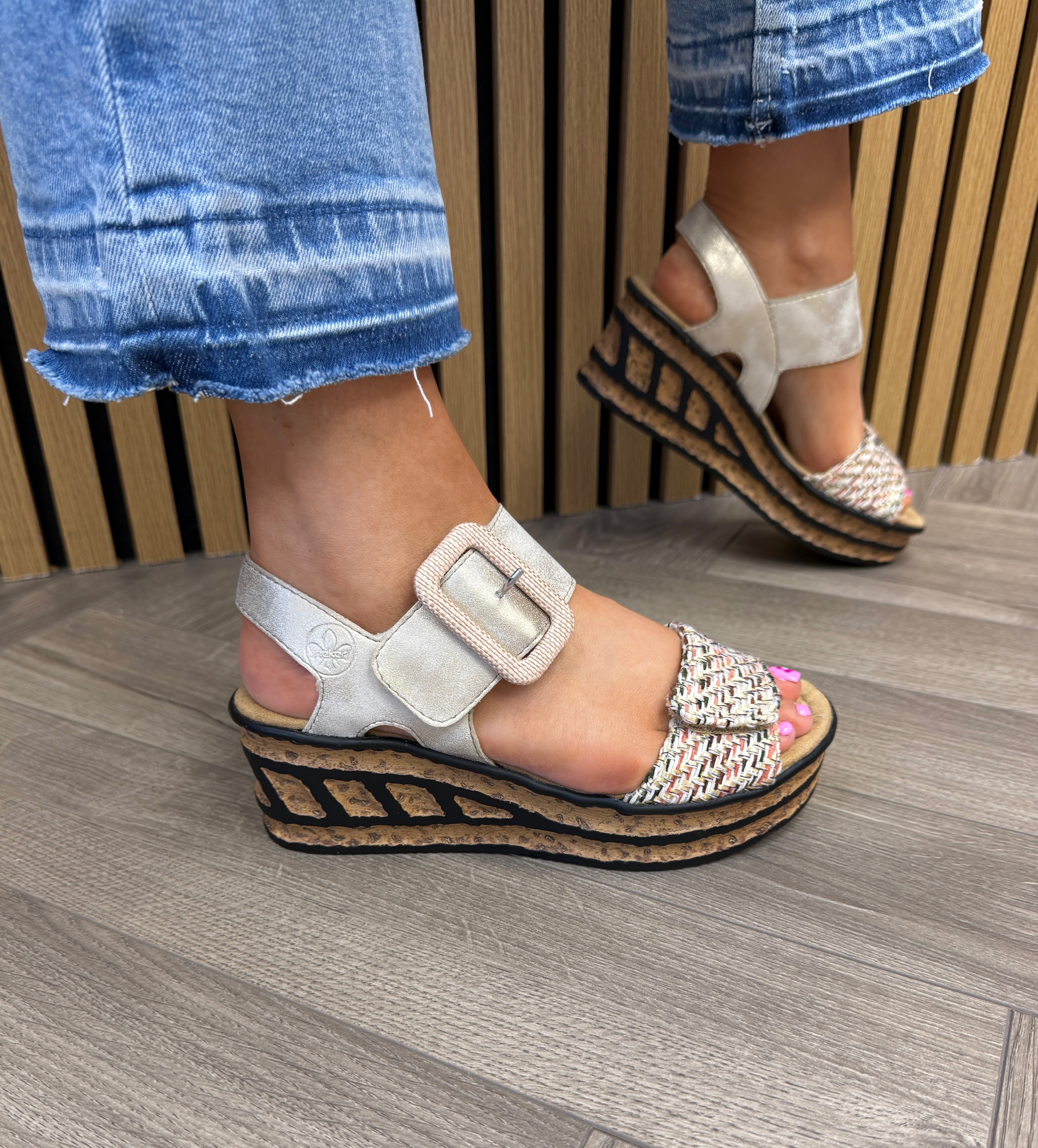 Rieker 68172-60 Wedge Sandal with Woven Glitter Front - Beige (RI56)