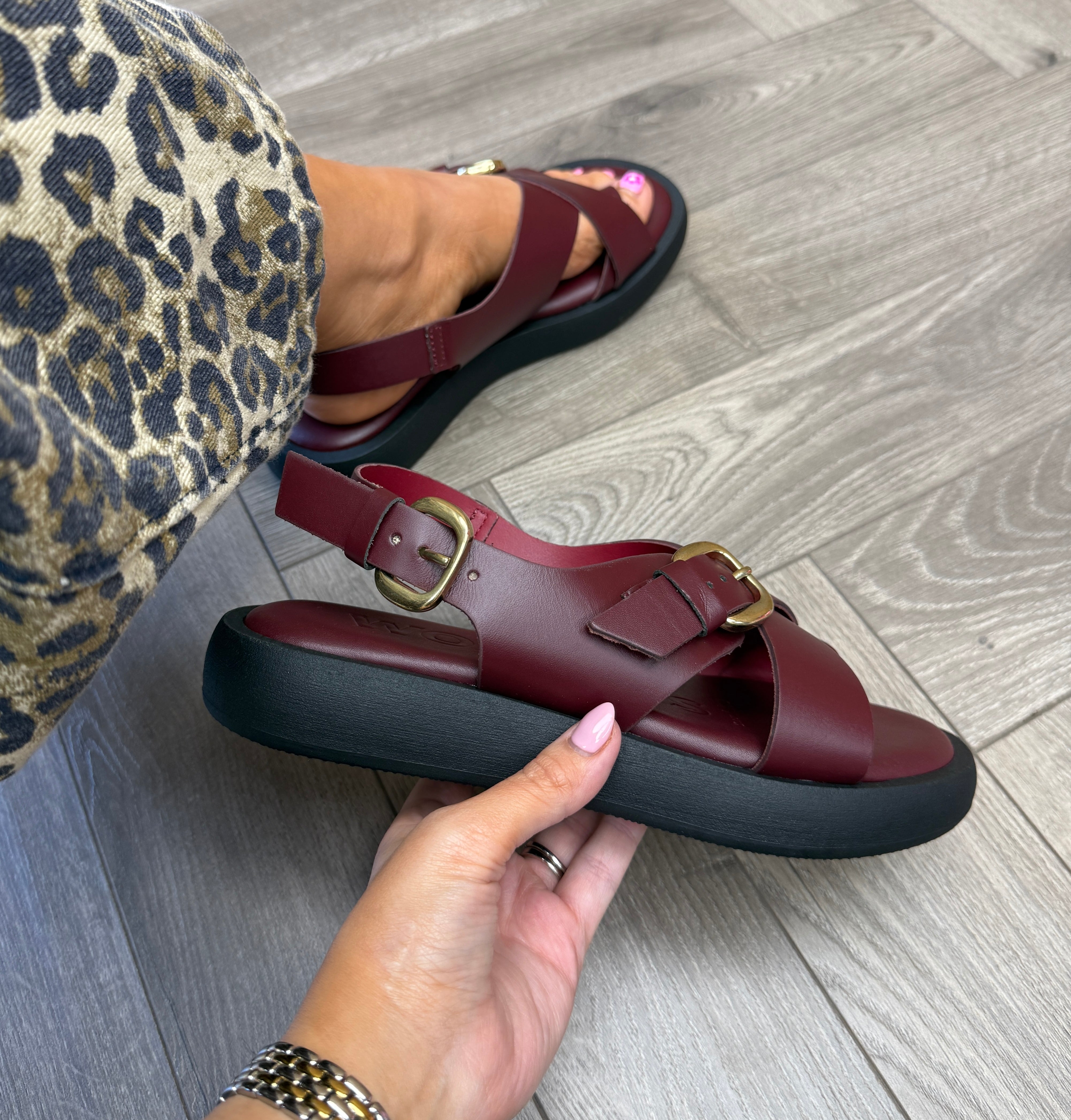 Leather. True to size. Adjustable strap.