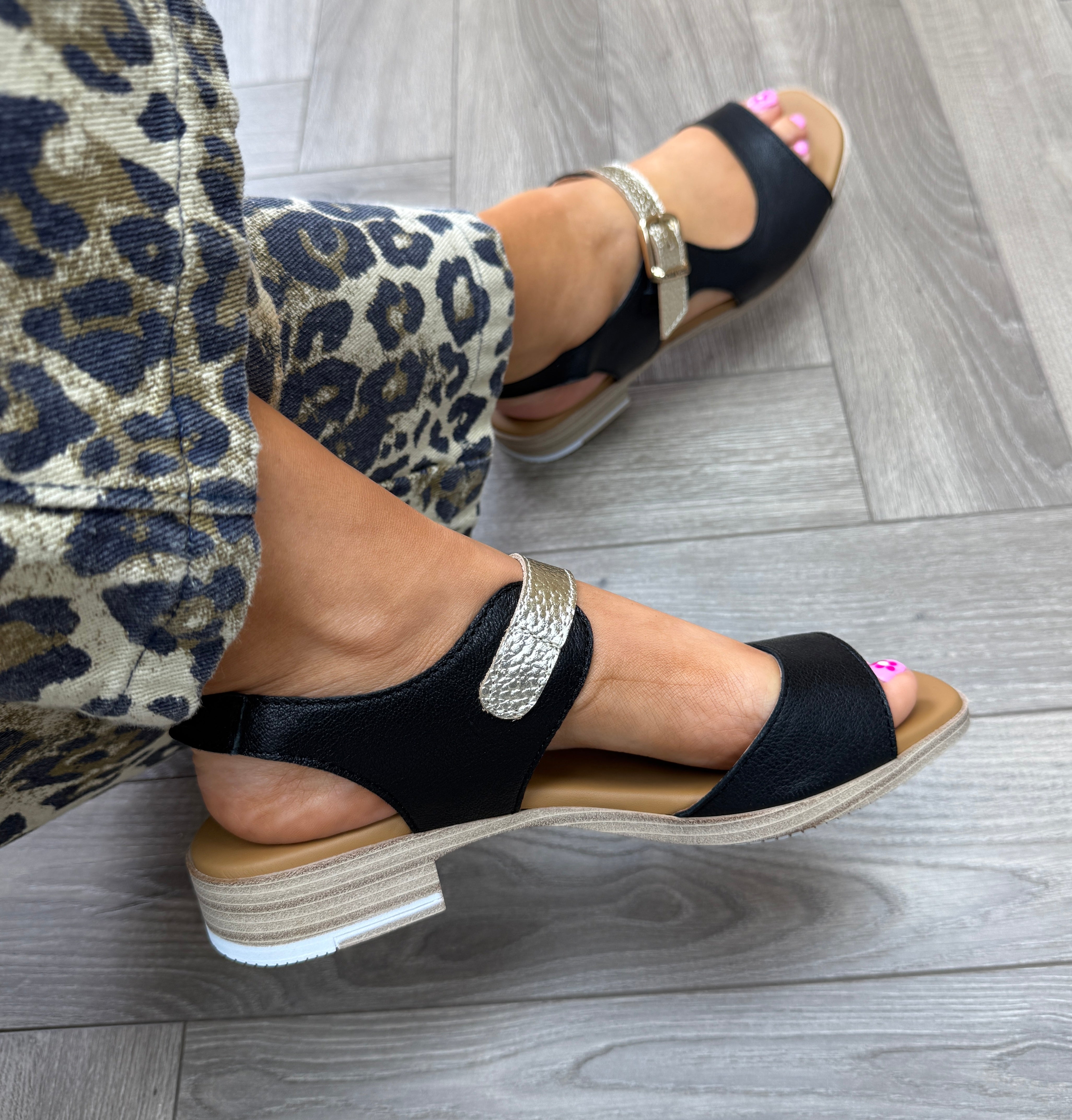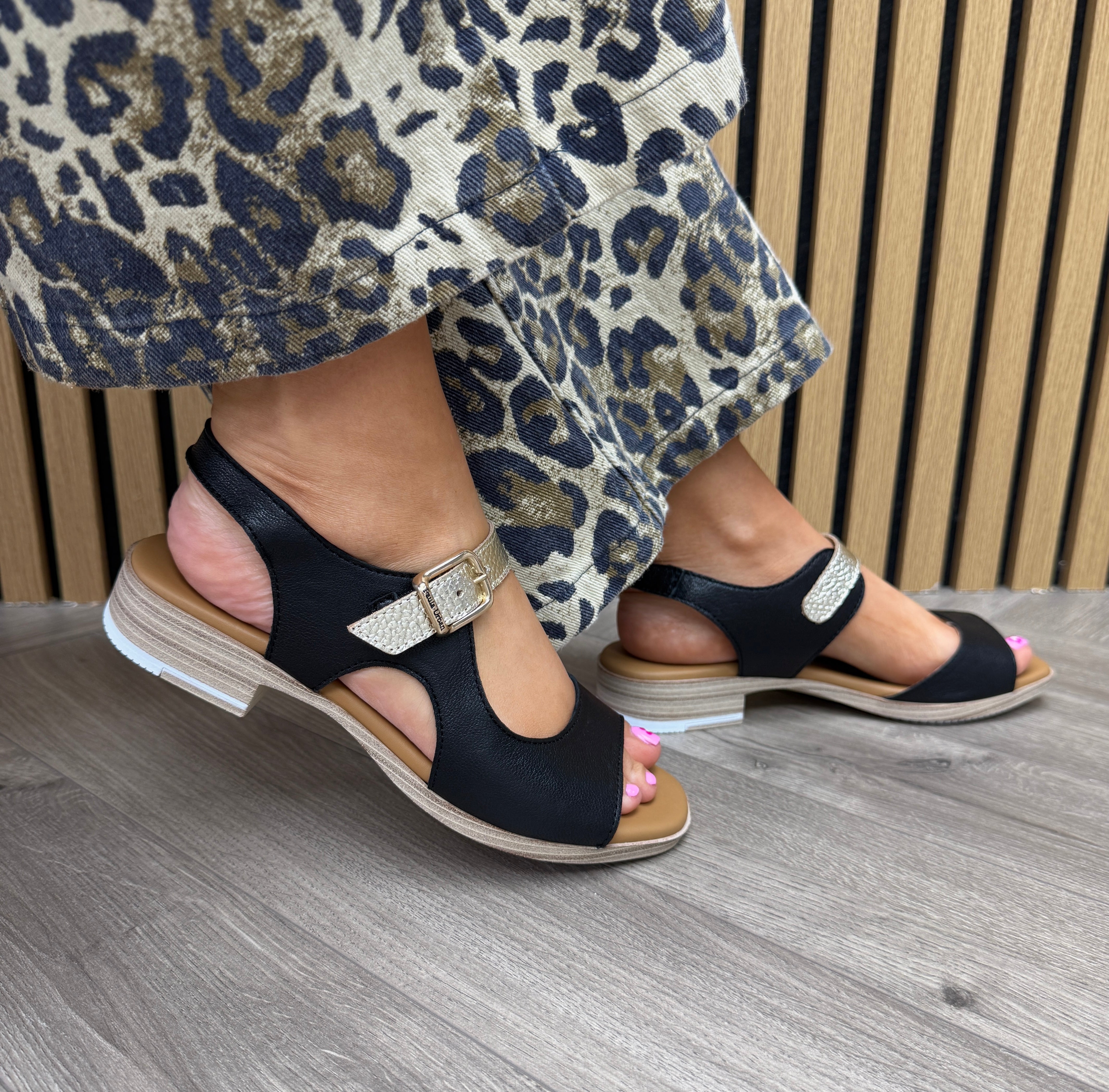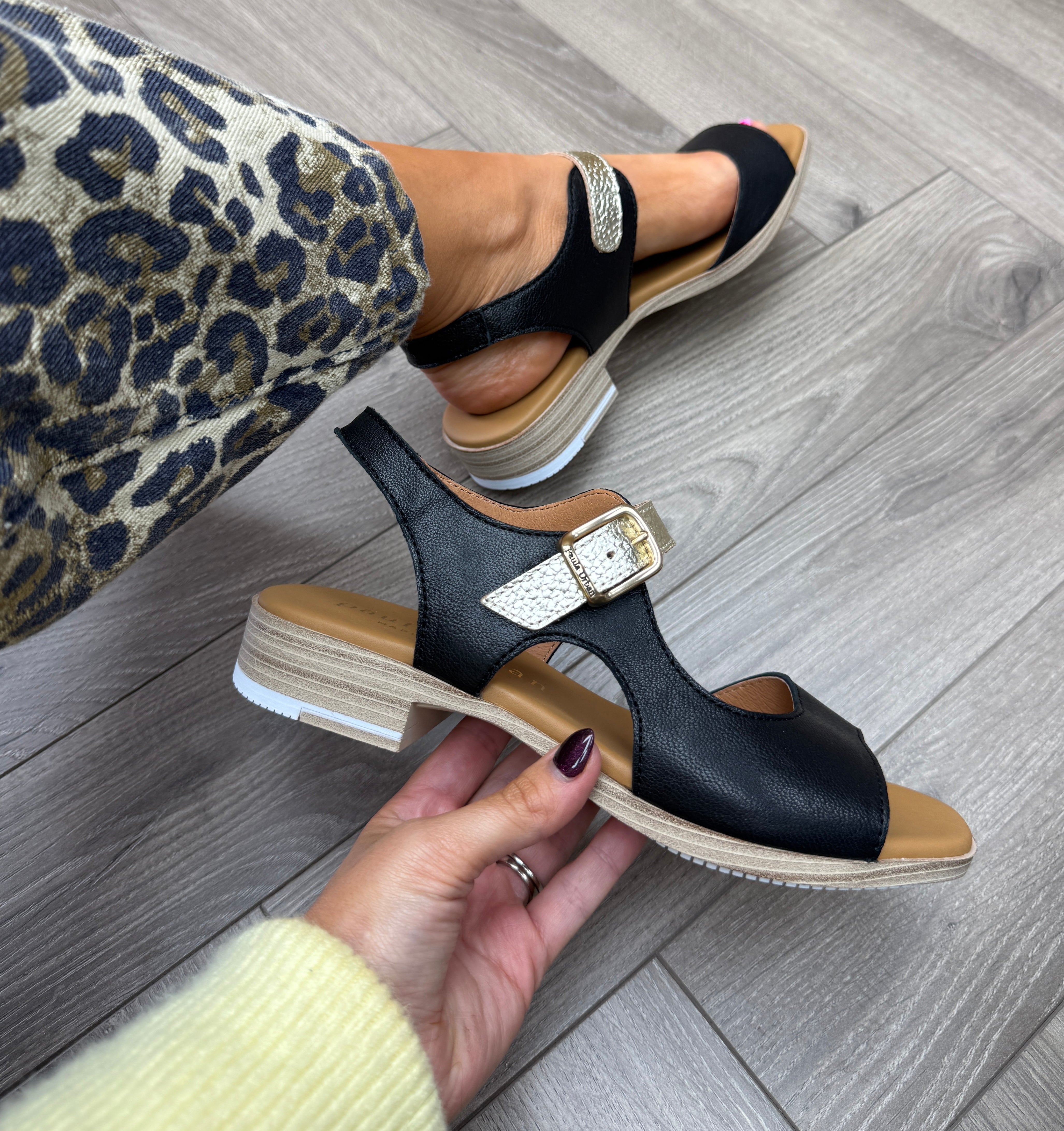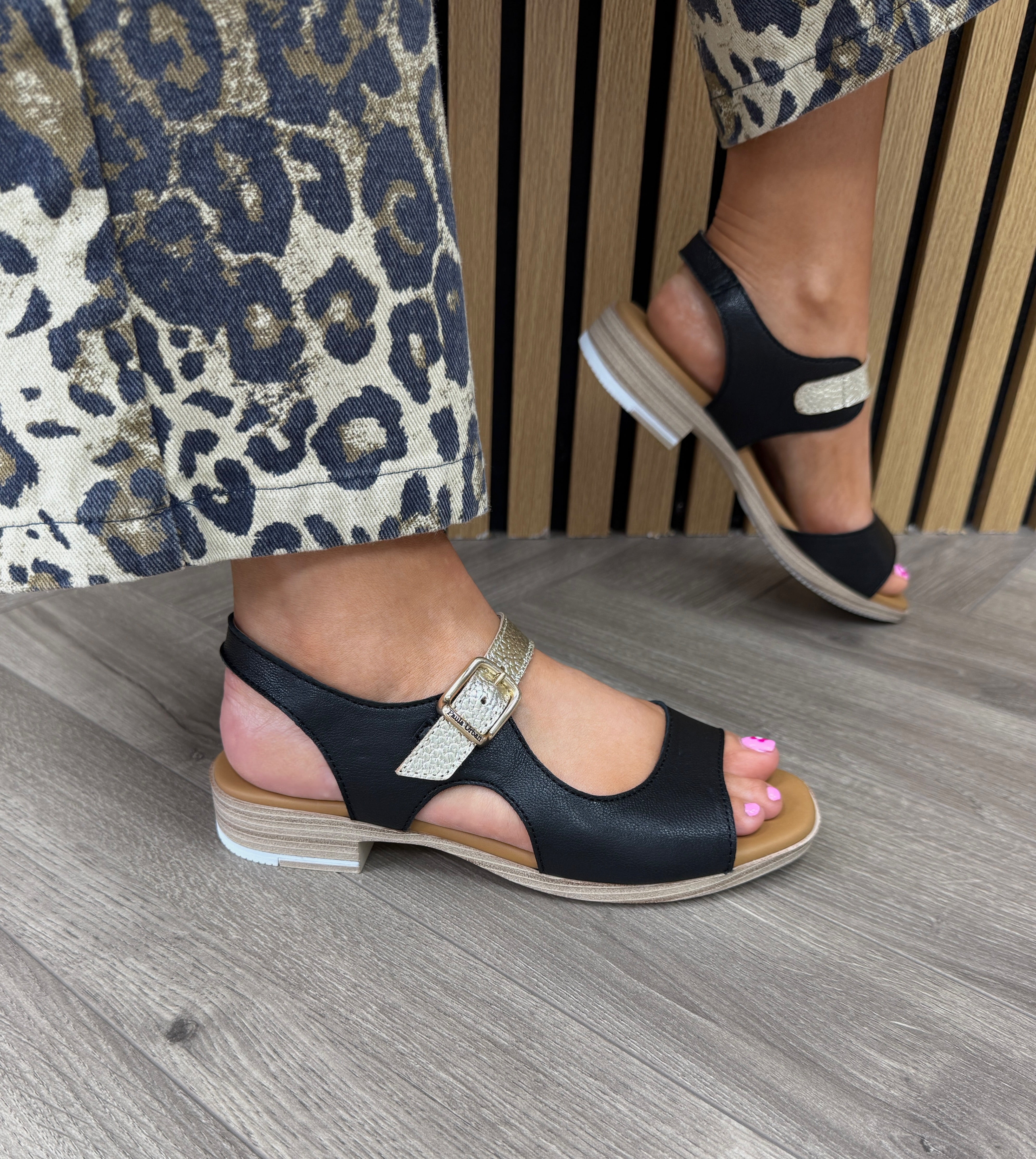 Paula Urban (SS26) ‘9-780’ Sunset Leather Cut-Out Sandal with Metallic Strap - Negro/Bogota Platino (PU3)