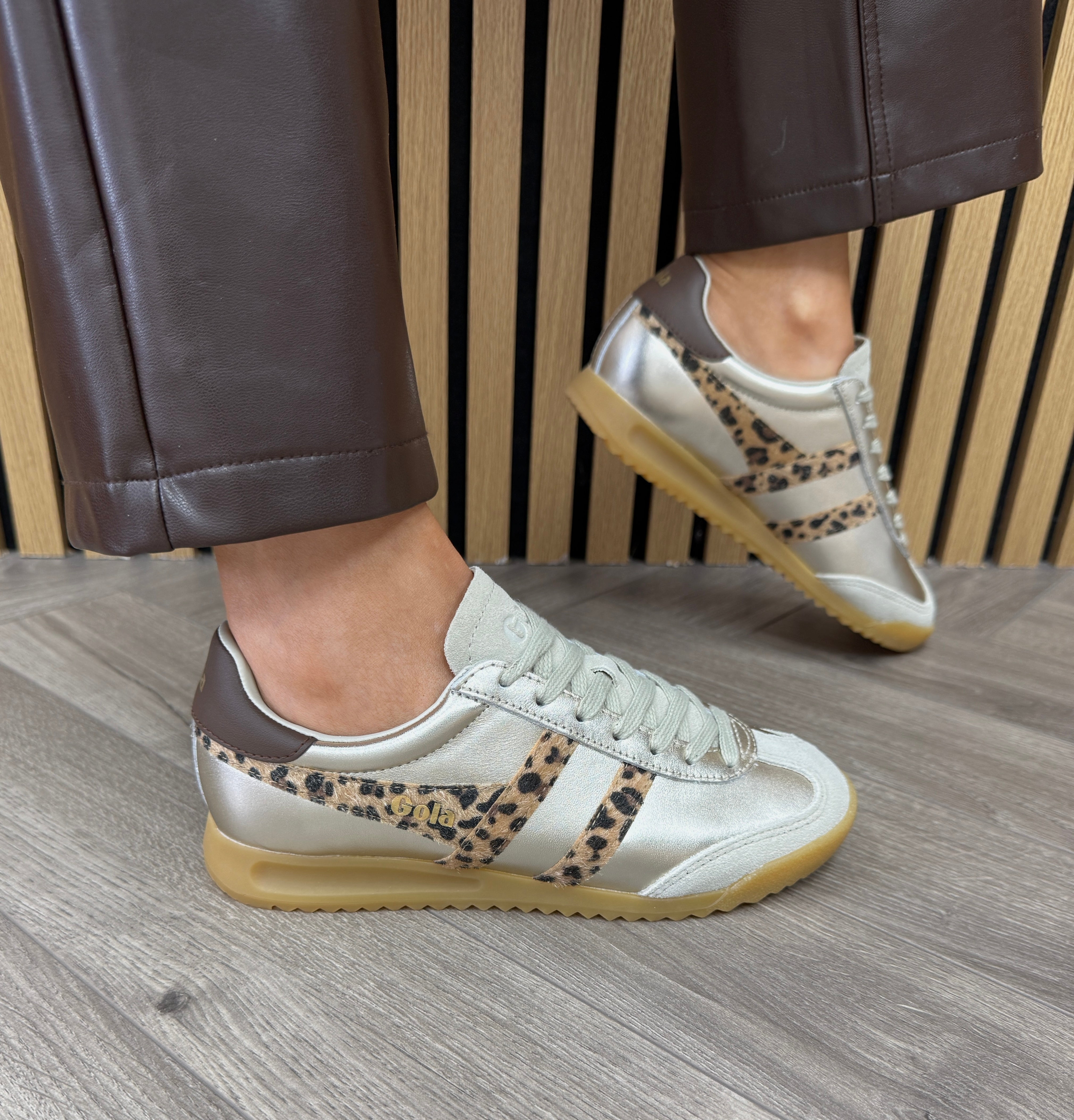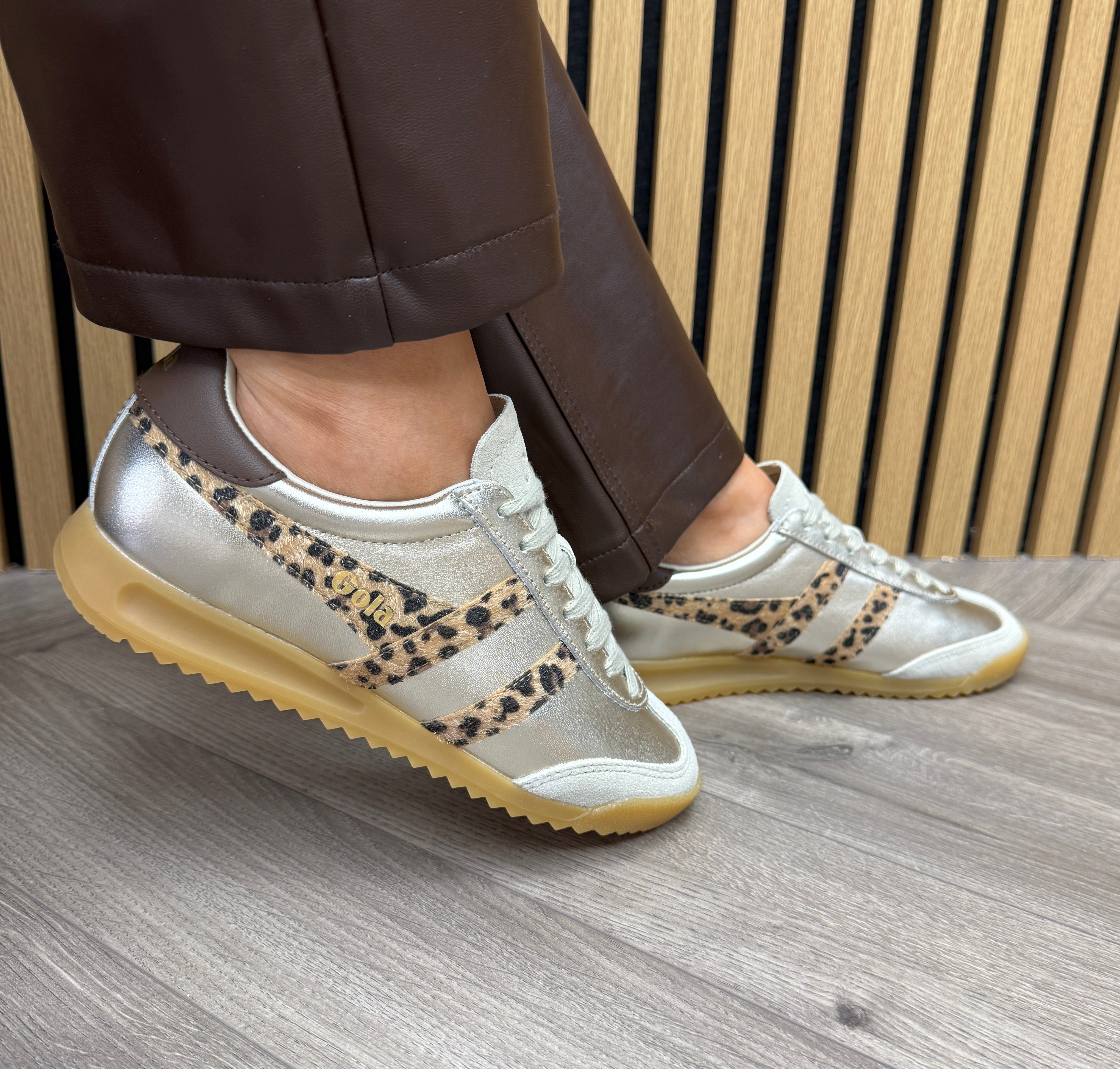 Gola (SS26) ‘Torpedo Glimmer Safari’ CLB856 Metallic Gum Sole Trainer with Leopard Print - Gold/Leopard/DarkBrown (GO7)
