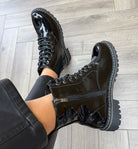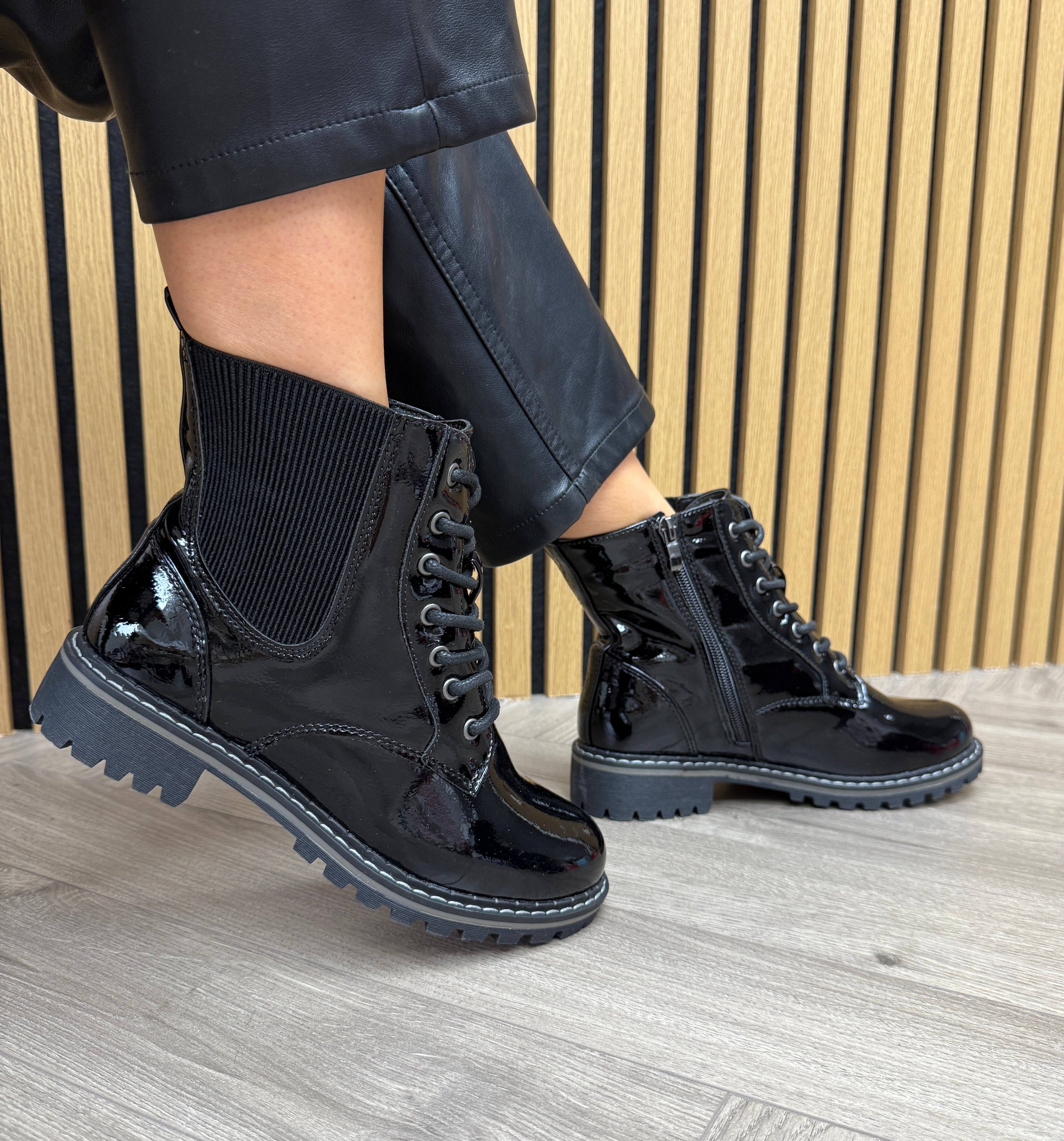 Lunar ‘Alexis’ GLW035 Patent Biker Boot With Elastic Side - Black (L47AW)