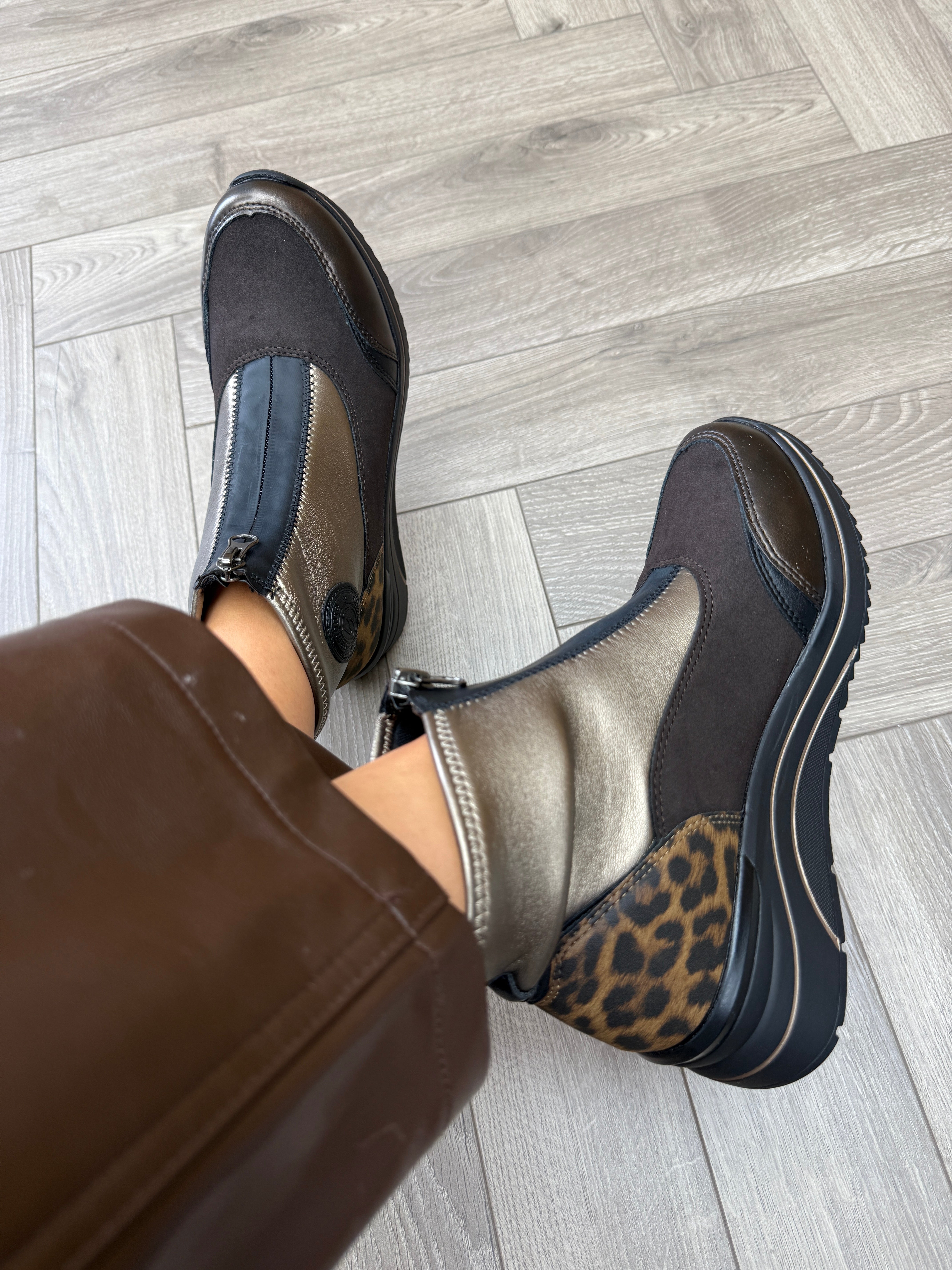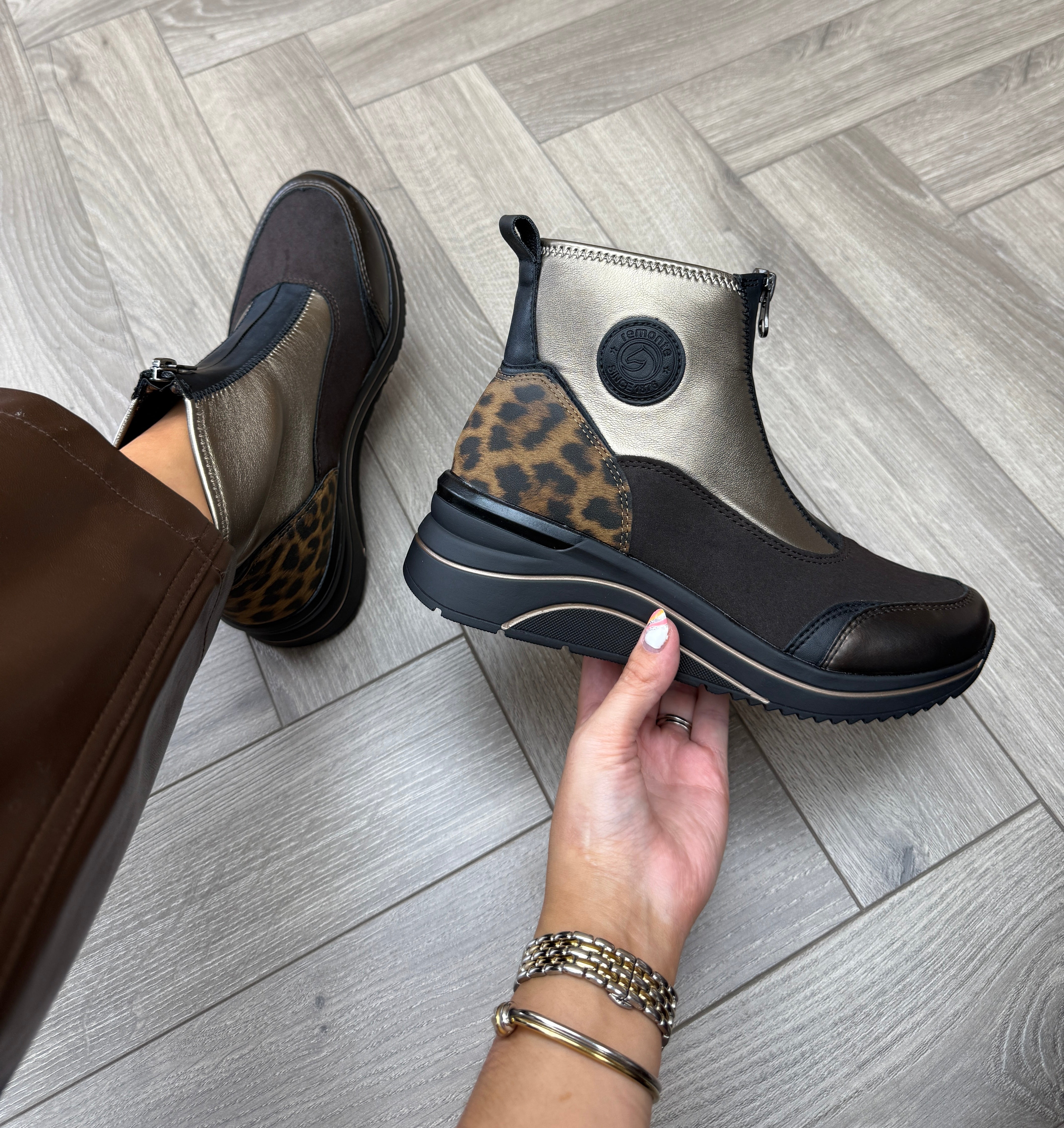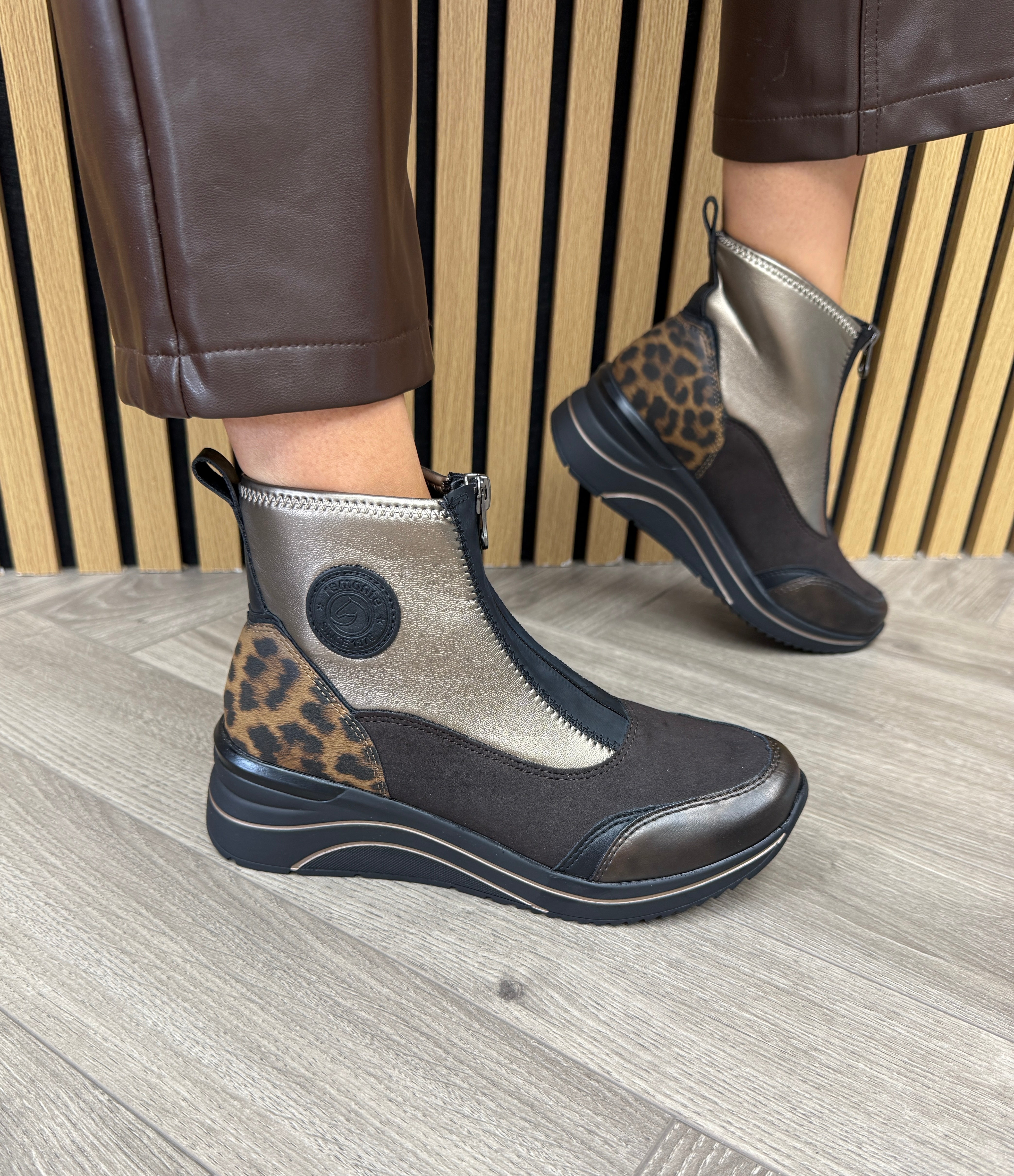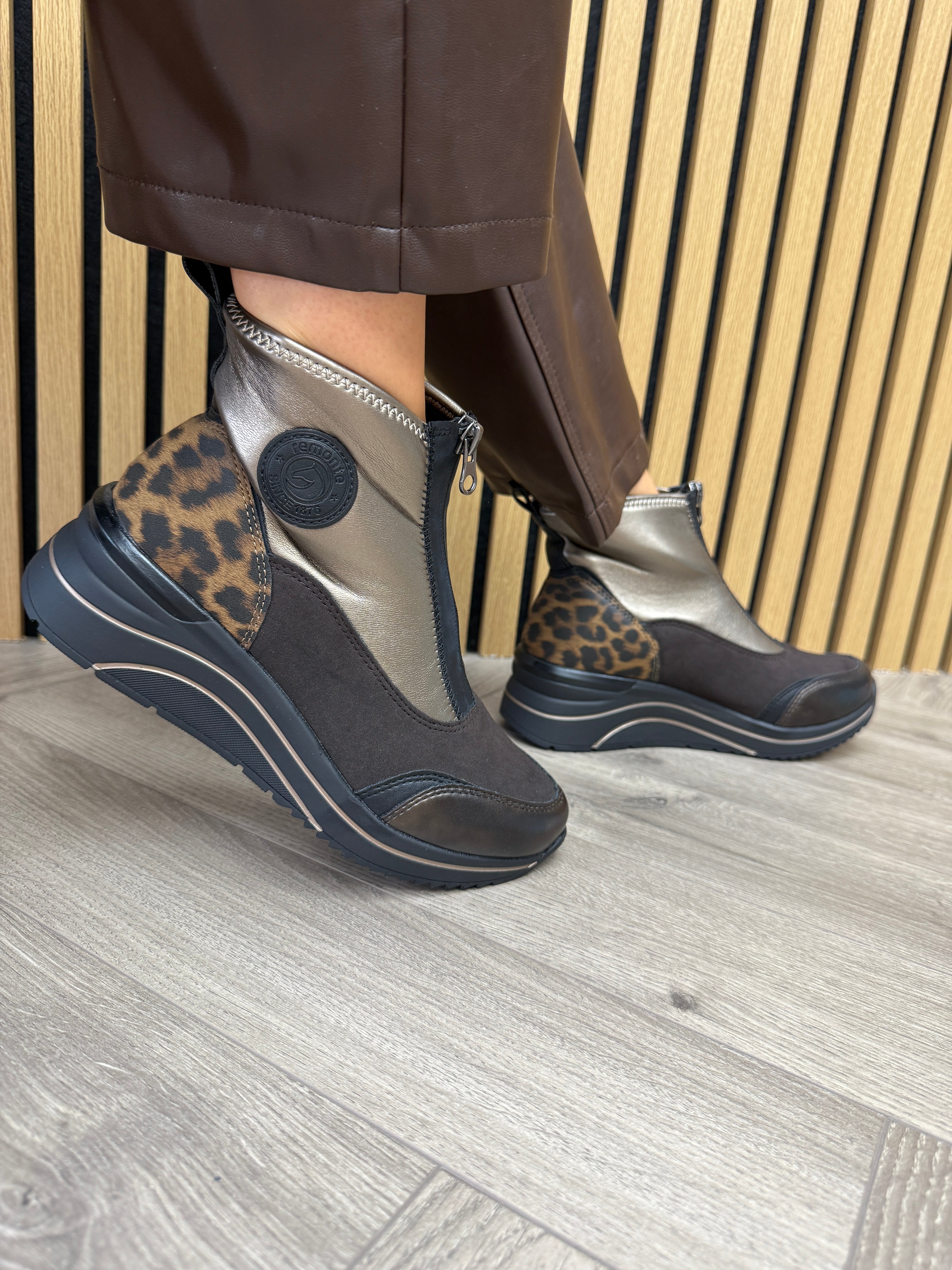 Remonte (REAW10) Front Zip Trainer Boot With Leopard Heel D0T78-90 - Metallic