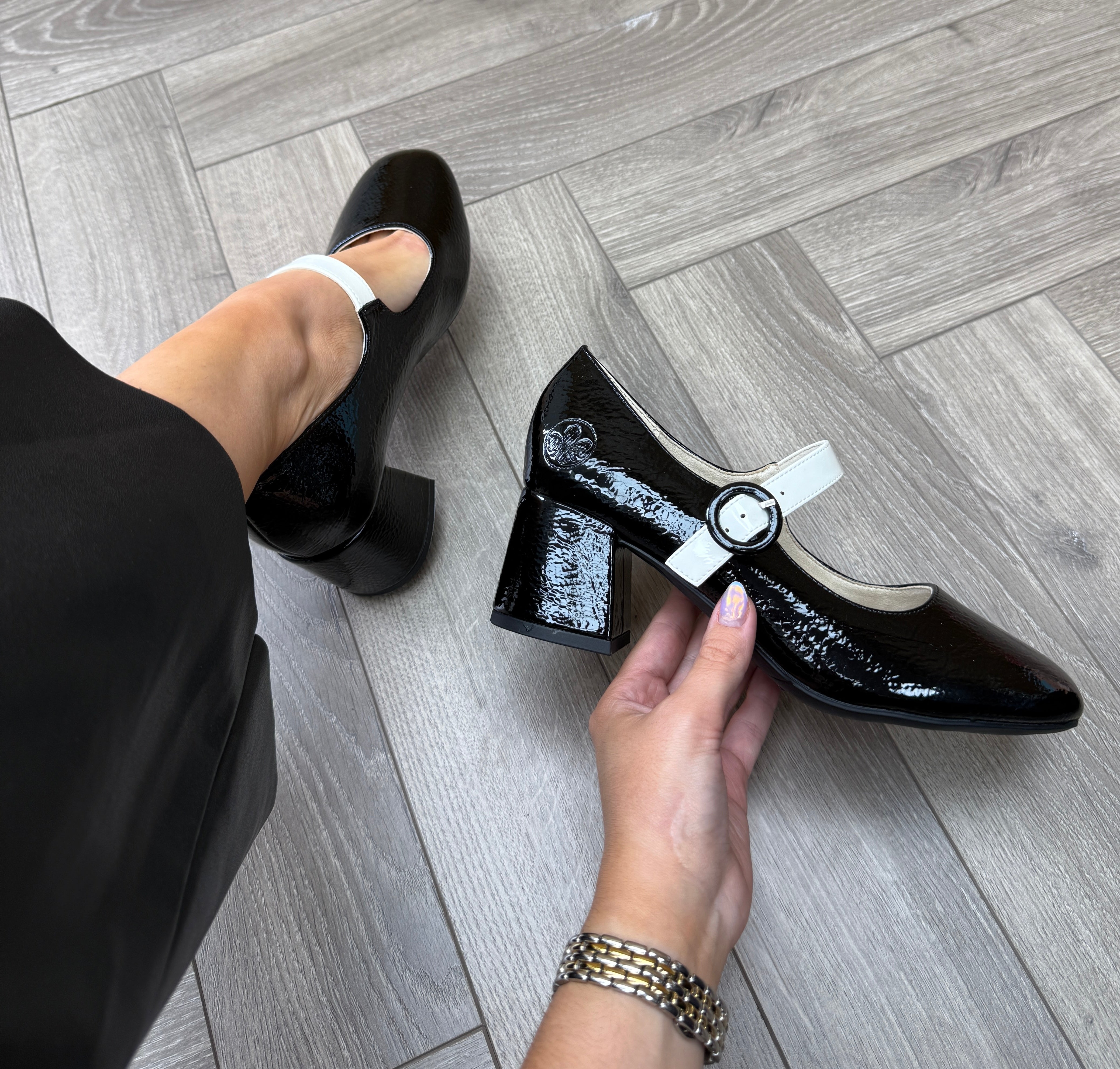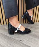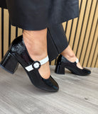 Rieker 44752-00 Patent Block Heel Shoe With White Strap - Black (RAW55)