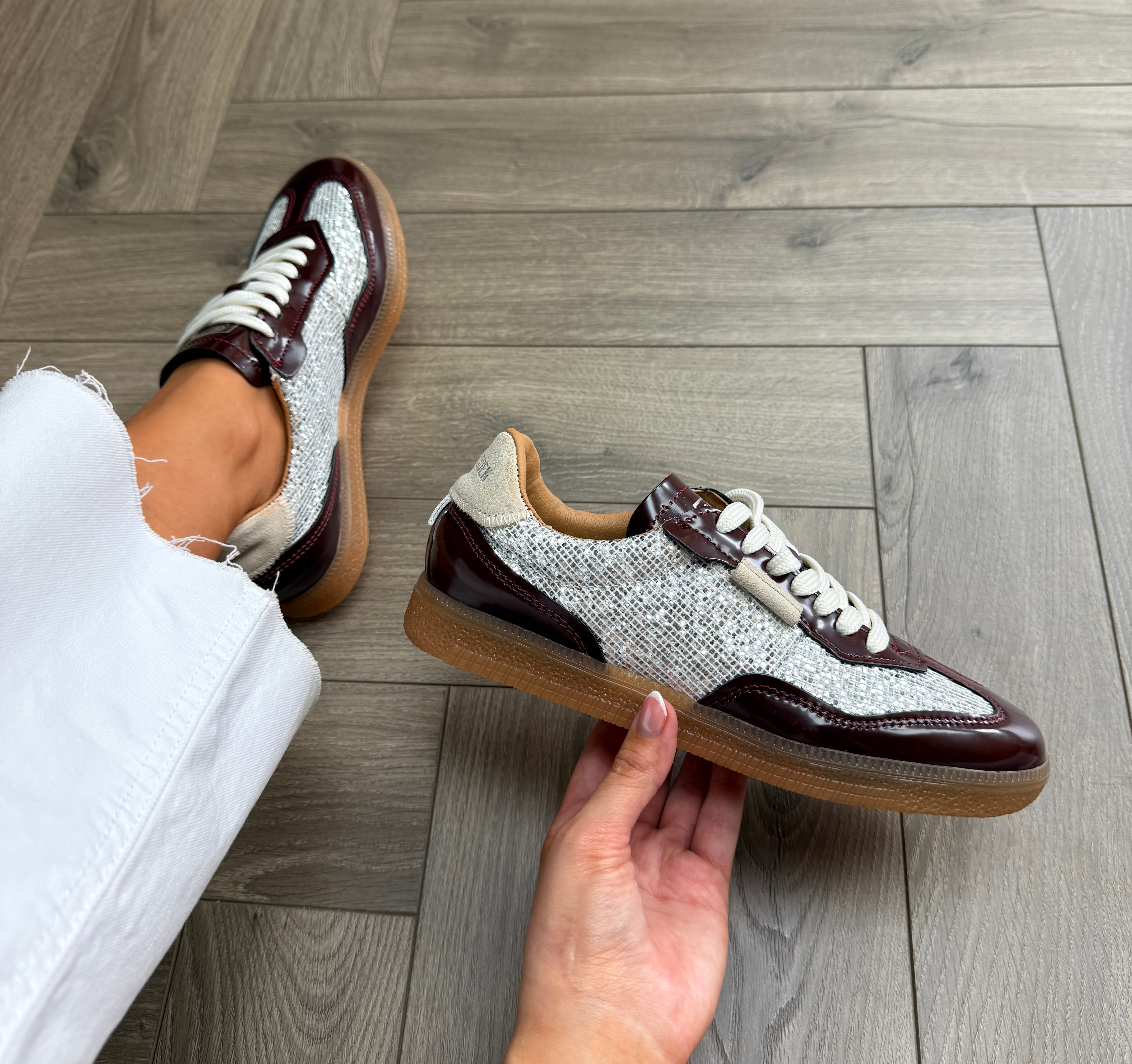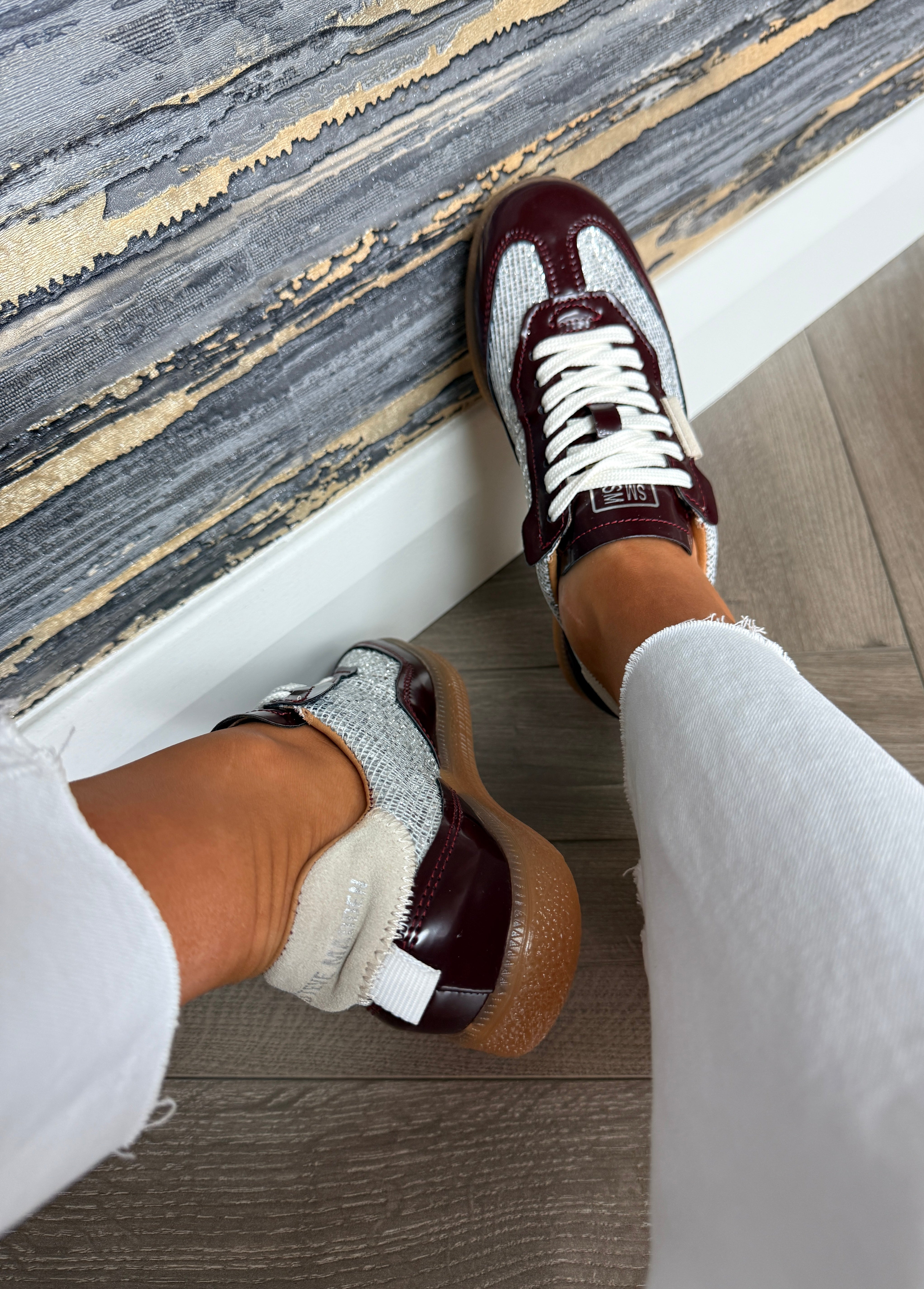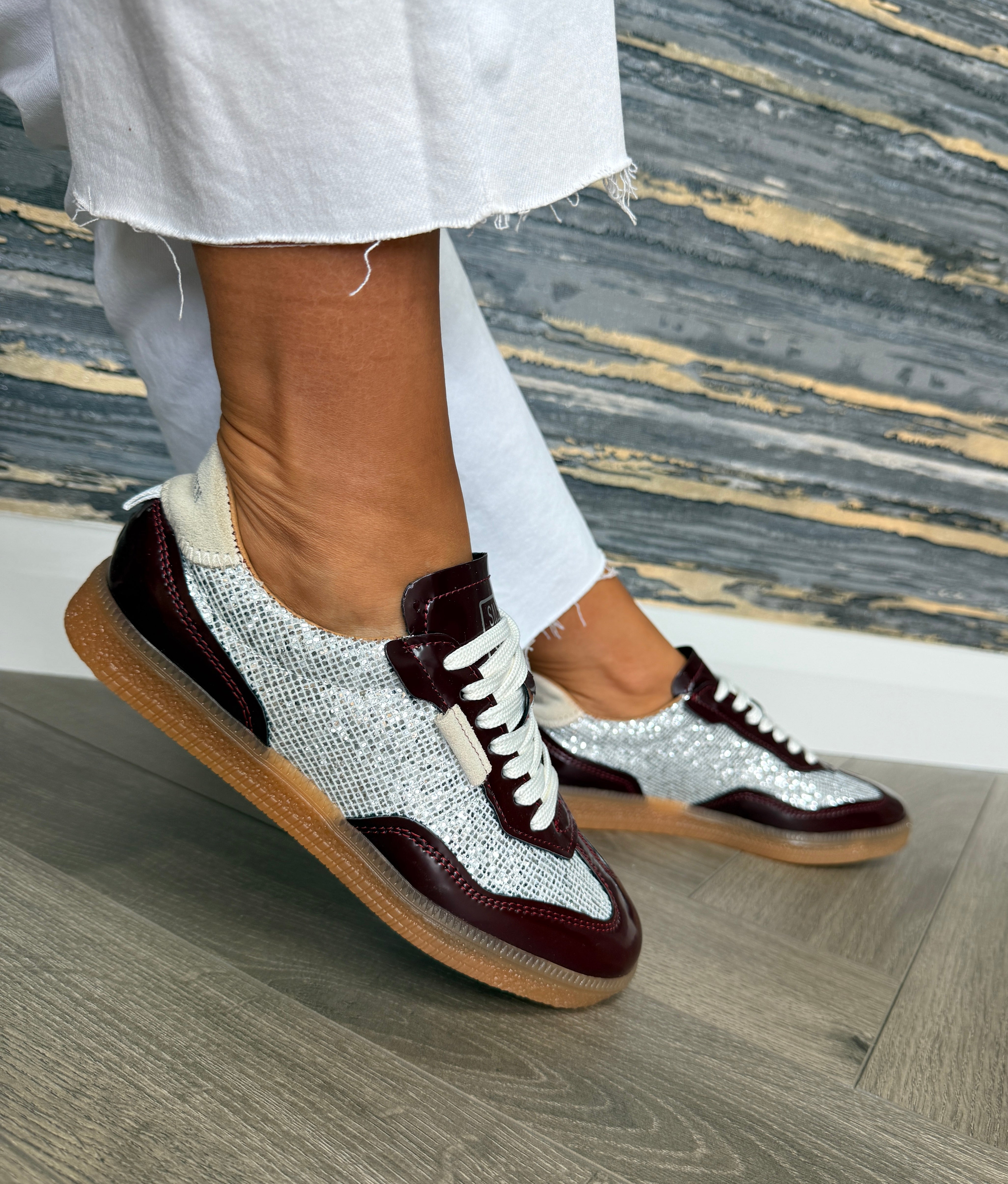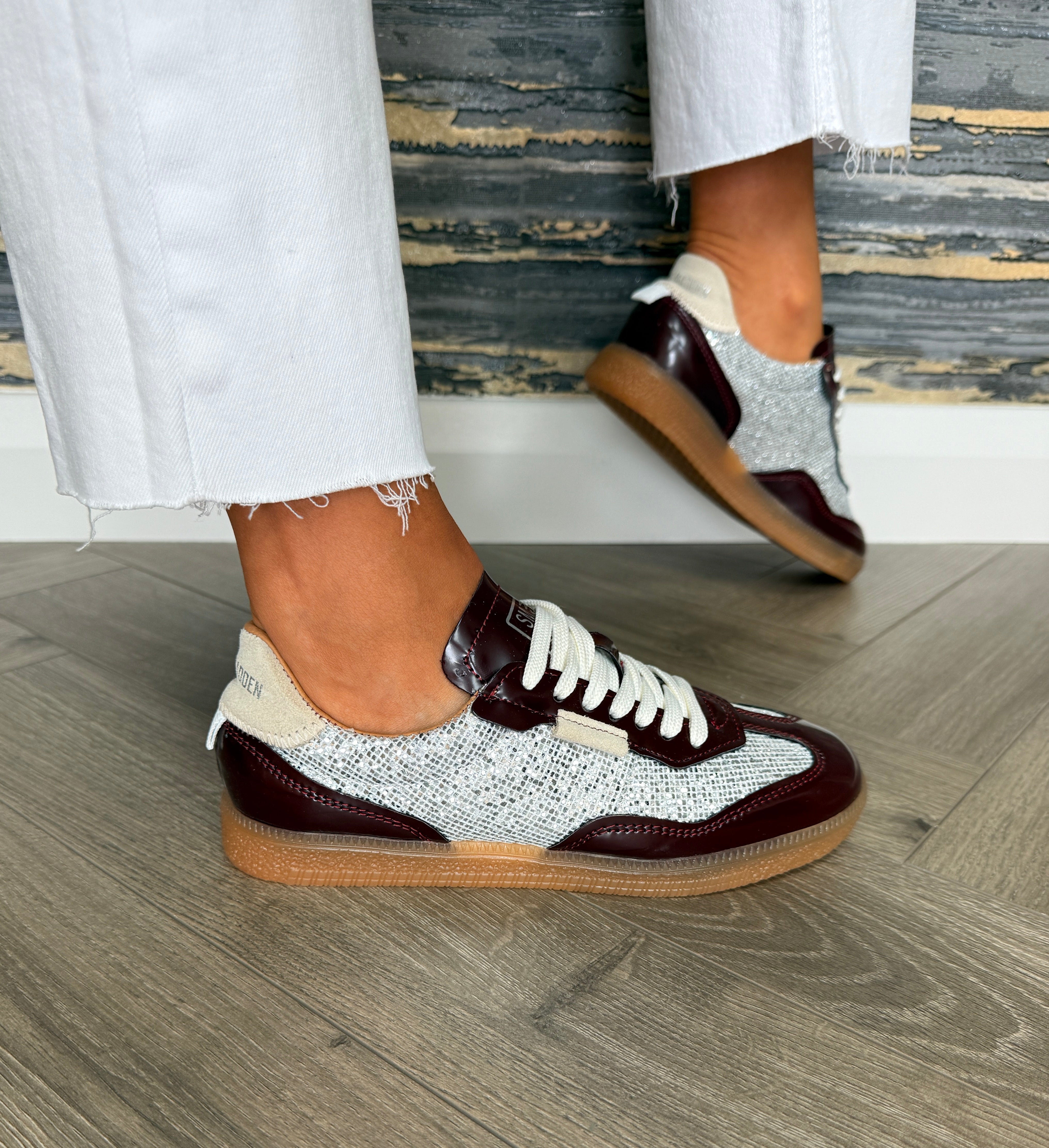Steve Madden (AW25) ‘Emporia’ Gum Sole Glitter Trainer with Patent Trim - Burgundy Multi (SMAW20)