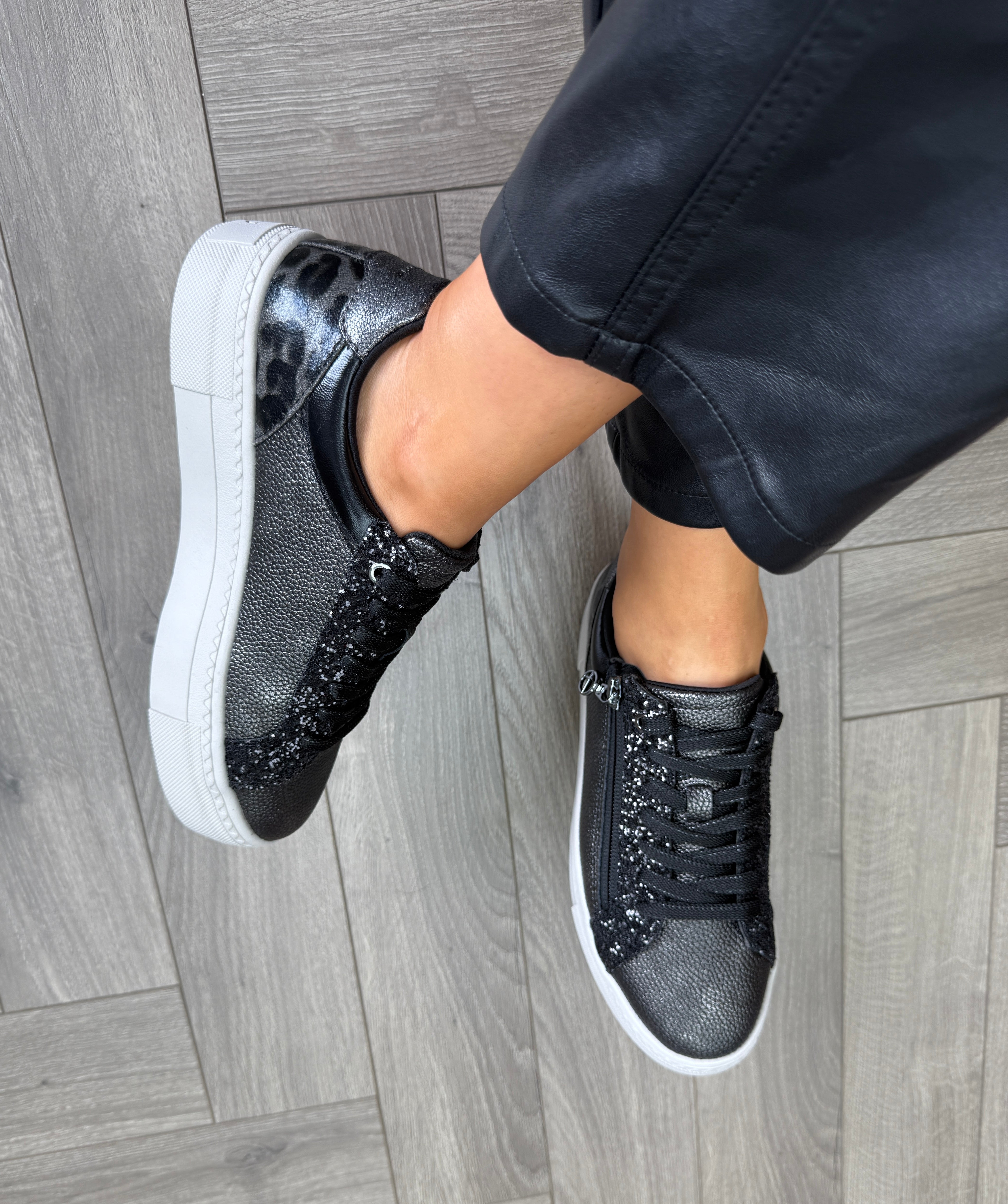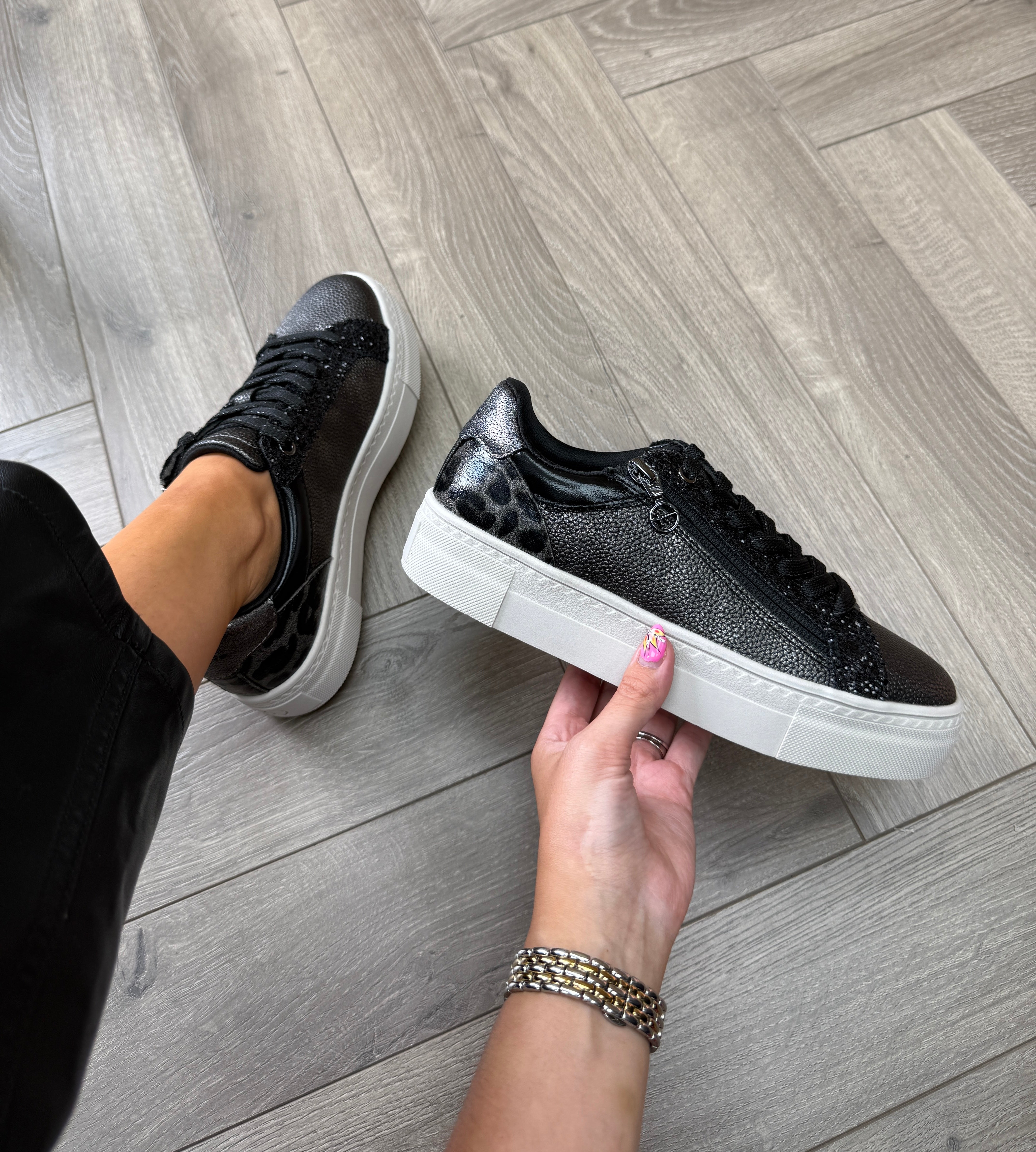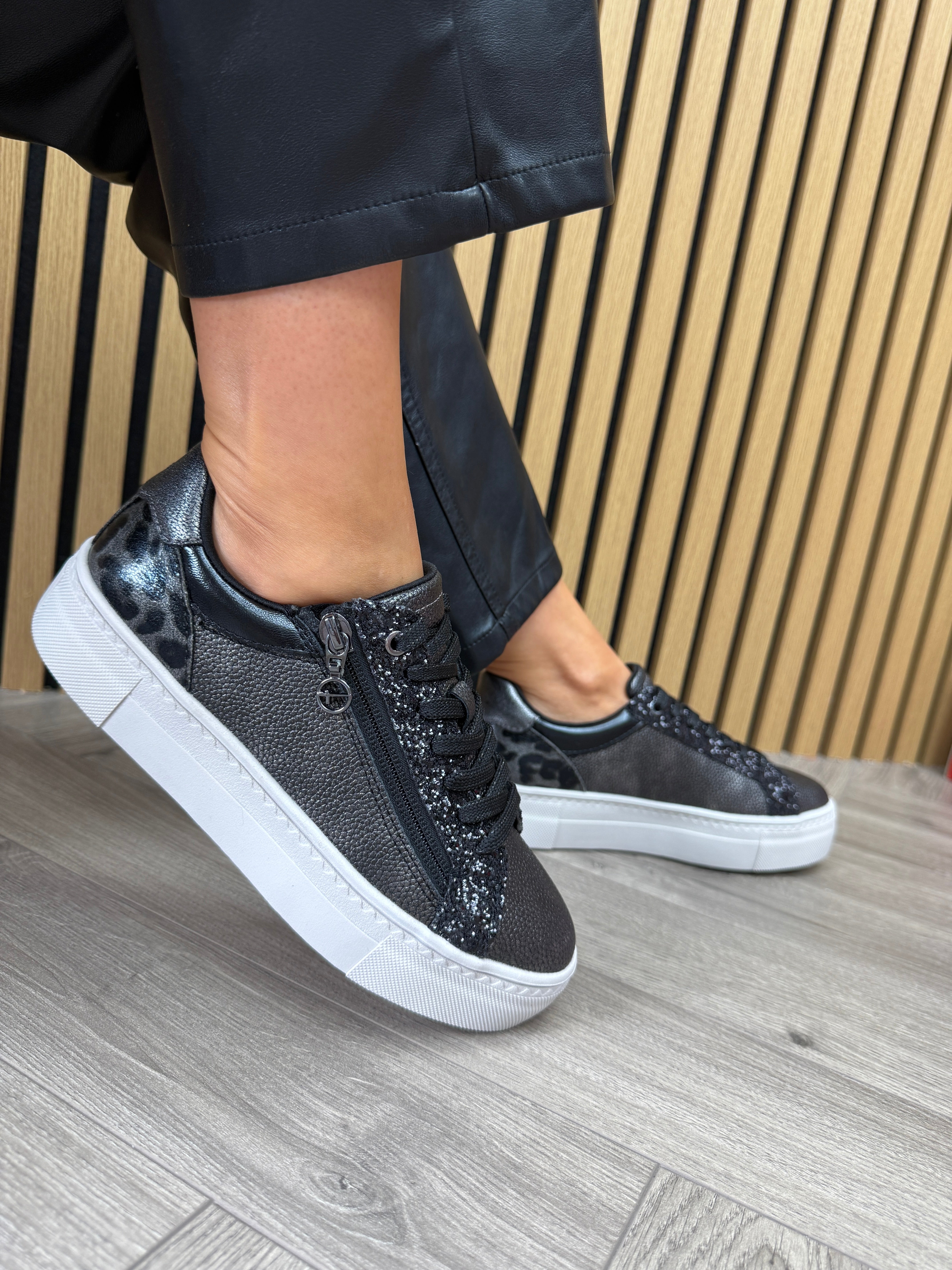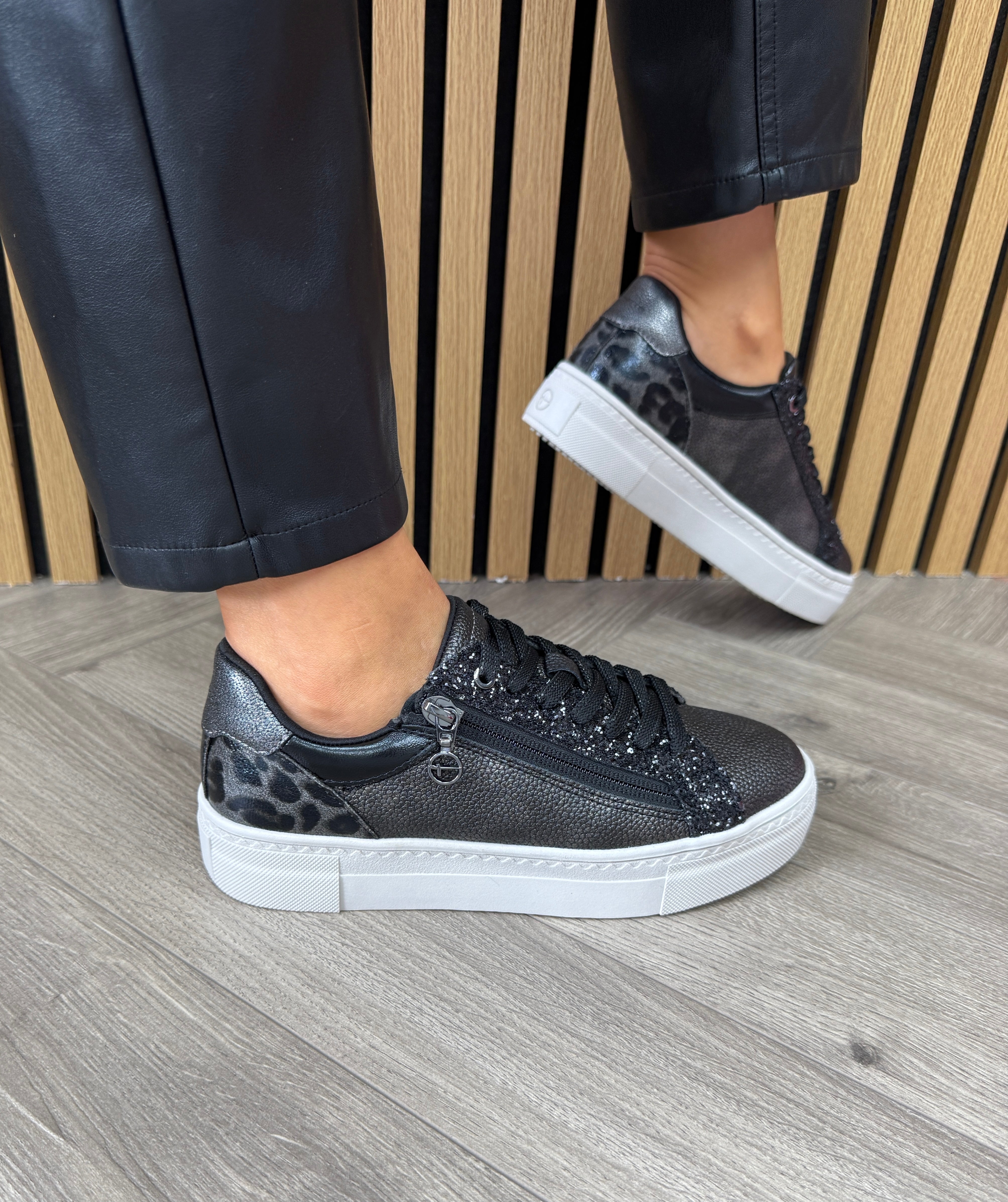 Tamaris (AW25) 1-23313-41 Platform Trainer With Glitter and Leopard Heel - Pewter Comb (TAW27)