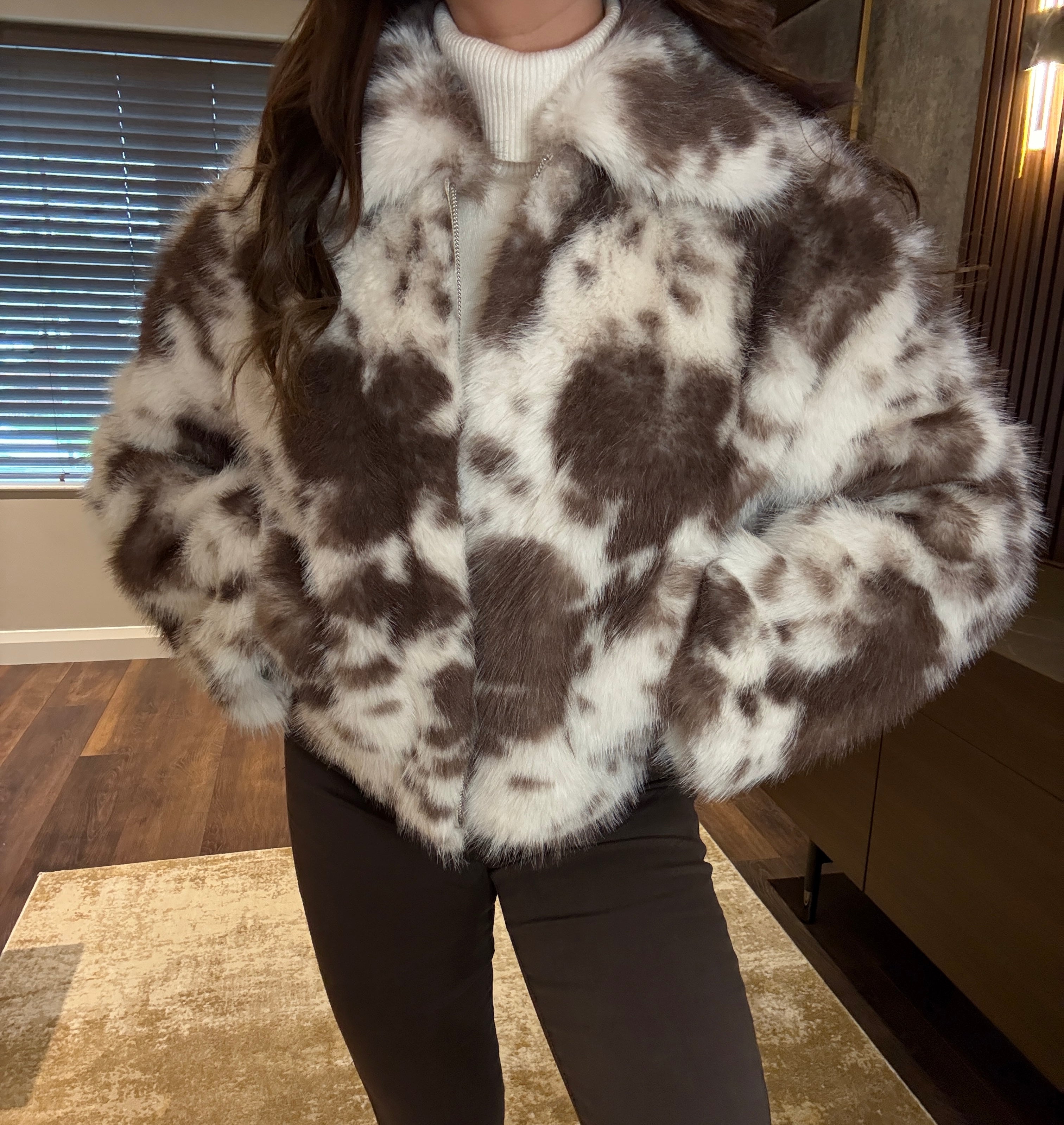 Cow Print Faux-Fur Bomber Jacket ‘F-077’ - Cream/Brown (CL6AW)